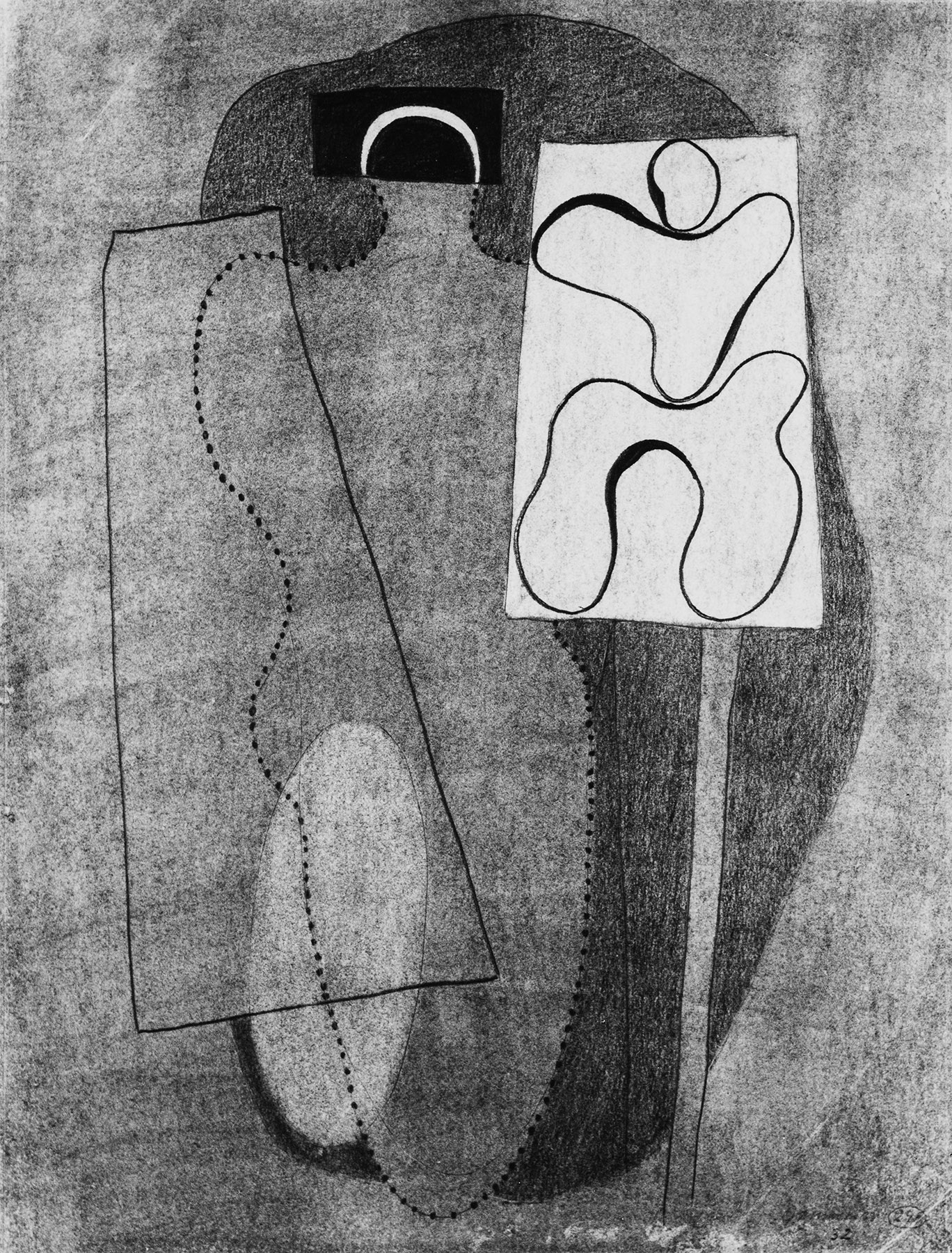 Bleistift, Kohle, gewischt, Ritzkonturen z. T. blind, Pauskonturen (mit Abweichungen), fixiert, Einfassungslinien, auf chamoisfarbigem, am Rand l. perforiertem Zeichenkarton