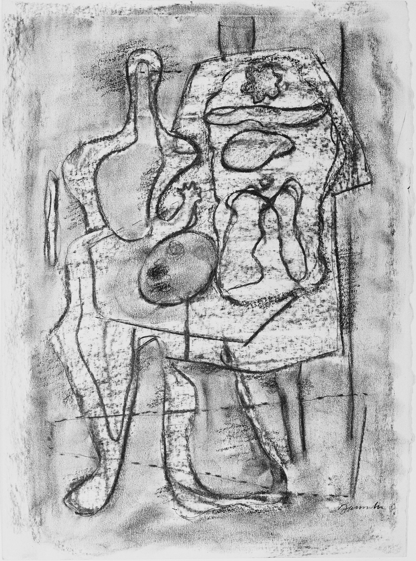Kohle, gewischt, Ölkreide in Rot, Orange, Gelb, Grün, Schwarz, Bleistift, Skizze in Kohle, auf chamoisfarbigem, am Rand r. im scharfen Knick unregelmäßig abgerissenen Zeichenkarton