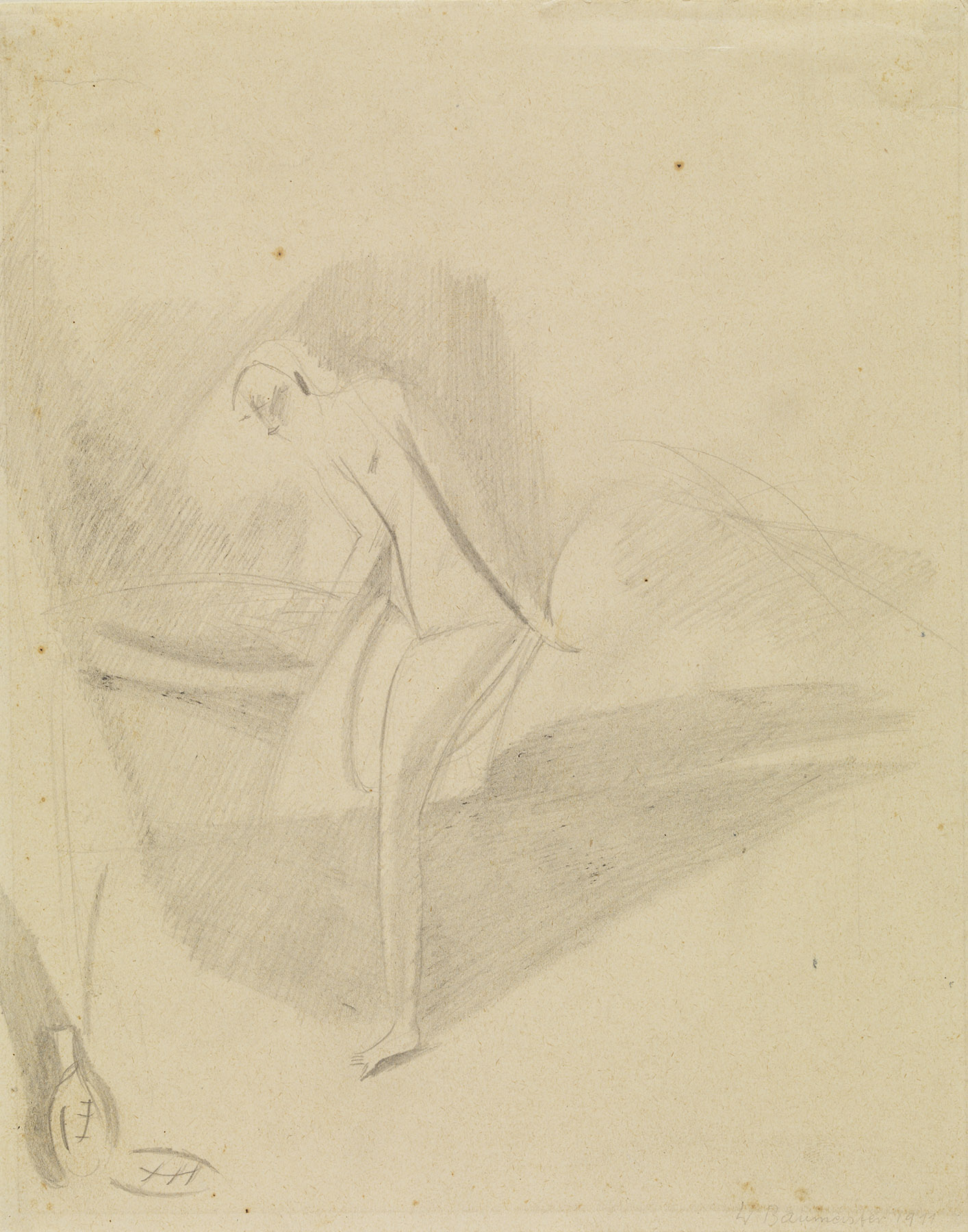Dieser Nr. ist eine Folge von weiteren vier, die Z 16-19, anzuschließen. Über diese Kompositionen, die männliche oder weibliche Akte im Raum oder in der Landschaft zum Thema haben, läßt sich leicht die Verbindung zu Meyer-Amden hersteilen, mit dem B. in dieser Zeit Kontakt hatte. Es ist offensichtlich, daß Baumeisters künstlerisches Thema die imaginäre, nicht abbildhaft-geometrische Beziehung von Körper und Raum sein soll.