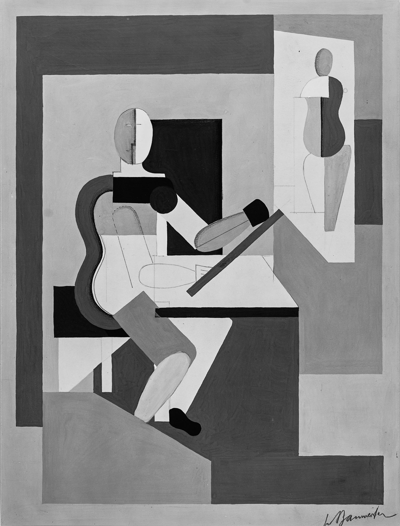 231 und 232: Beide Blätter sind sich außerordentlich ähnlich. Ihre Signaturen sind fast identisch und stammen nicht von B., sondern von Karl Raible, der in einem Brief vom 5. 7. 1977 mitteilt, er habe als Schüler und Mitarbeiter Baumeisters „seine grafischen Arbeiten auch z. T. ausgearbeitet, ferner nach seinen farbigen Kleinskizzen diese auf Großformate übertrager". Es ist denkbar, daß er bei diesen beiden Blättern beteiligt war, zumal sie aus dem Besitz Karl Raibles stammen. - Schülerschaft und Mitarbeit von Karl Raible sind bisher von anderer Seite nicht belegt, weder im schriftlichen Nachlaß Baumeisters noch durch Zeugen. (fkb)