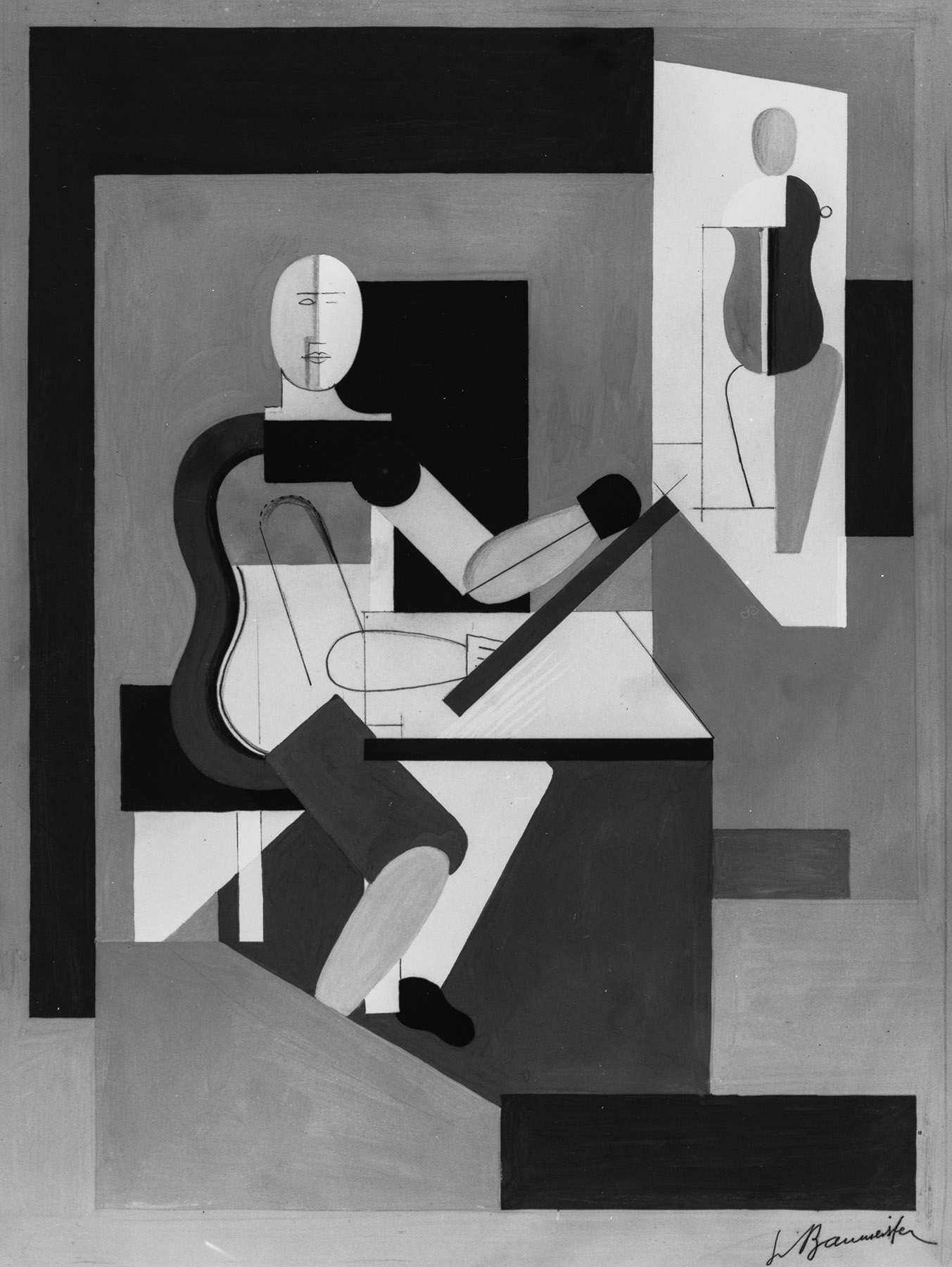 Bleistift, unter Verwendung von Zirkel und Lineal, Farbstifte, Deckfarbe, auf chamoisfarbigem, am Rand l. unregelmäßig beschnittenem Zeichenkarton