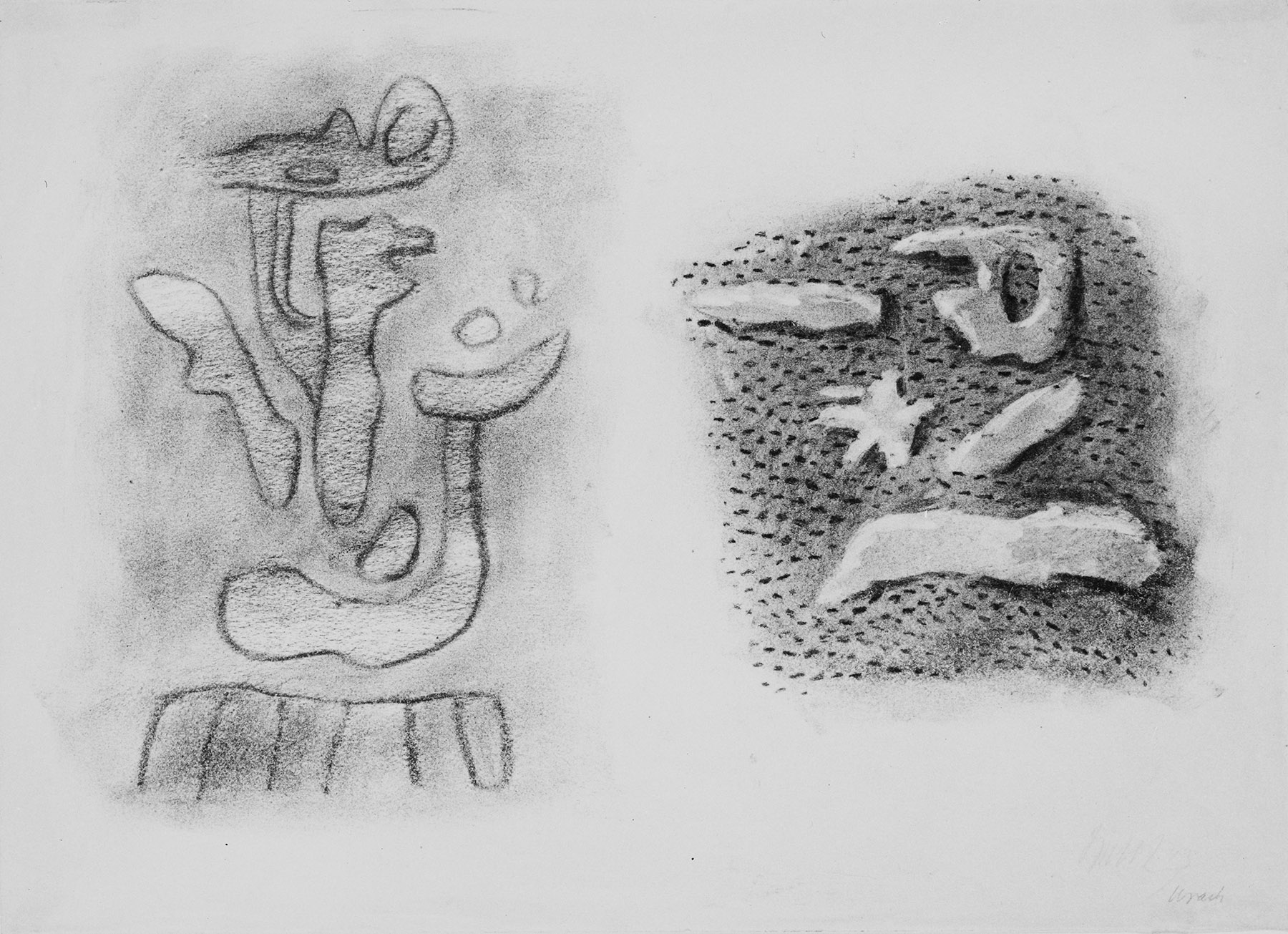 Kohle, gewischt, radiert, Ölkreide in Braun, fixiert, auf chamoisfarbigem Zeichenpapier