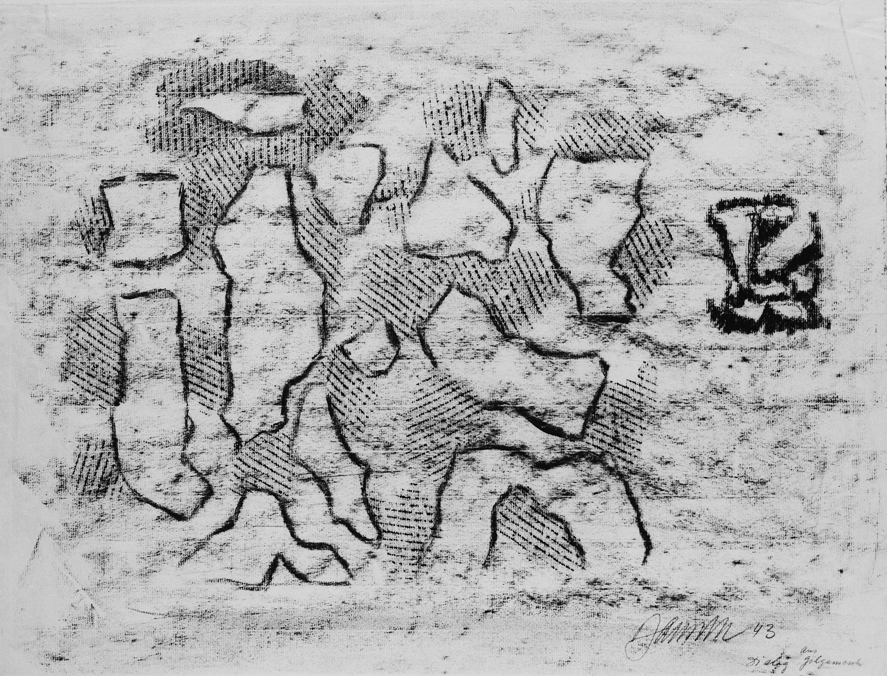 Kohle, z. T. gewischt, Ölkreide in Schwarz, durchgerieben, fixiert, auf chamoisfarbigem Ingres-Bütten