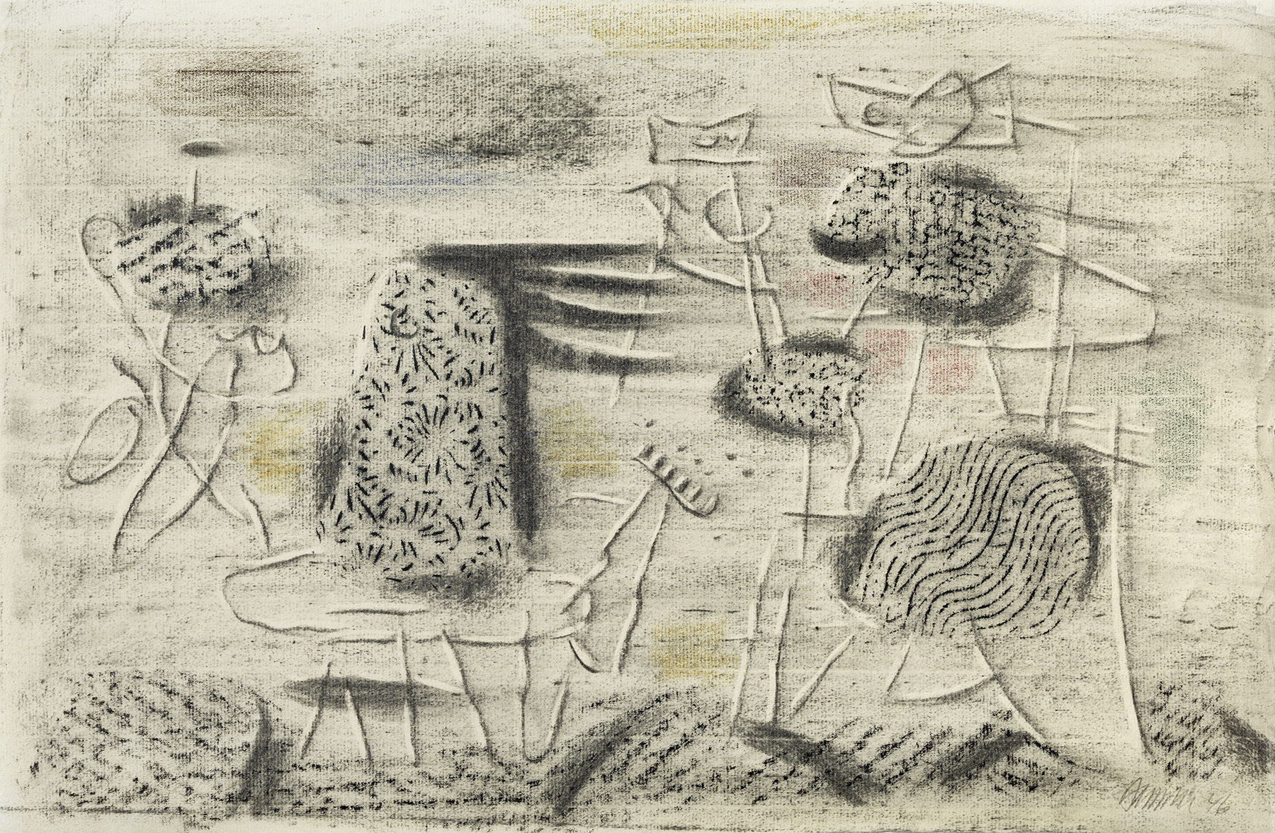 Kohle, gewischt, radiert, Ölkreide in Schwarz, durchgerieben, Rot, Grün, Blau, Braun, Ocker, fixiert, auf chamoisfarbigem Ingres-Bütten