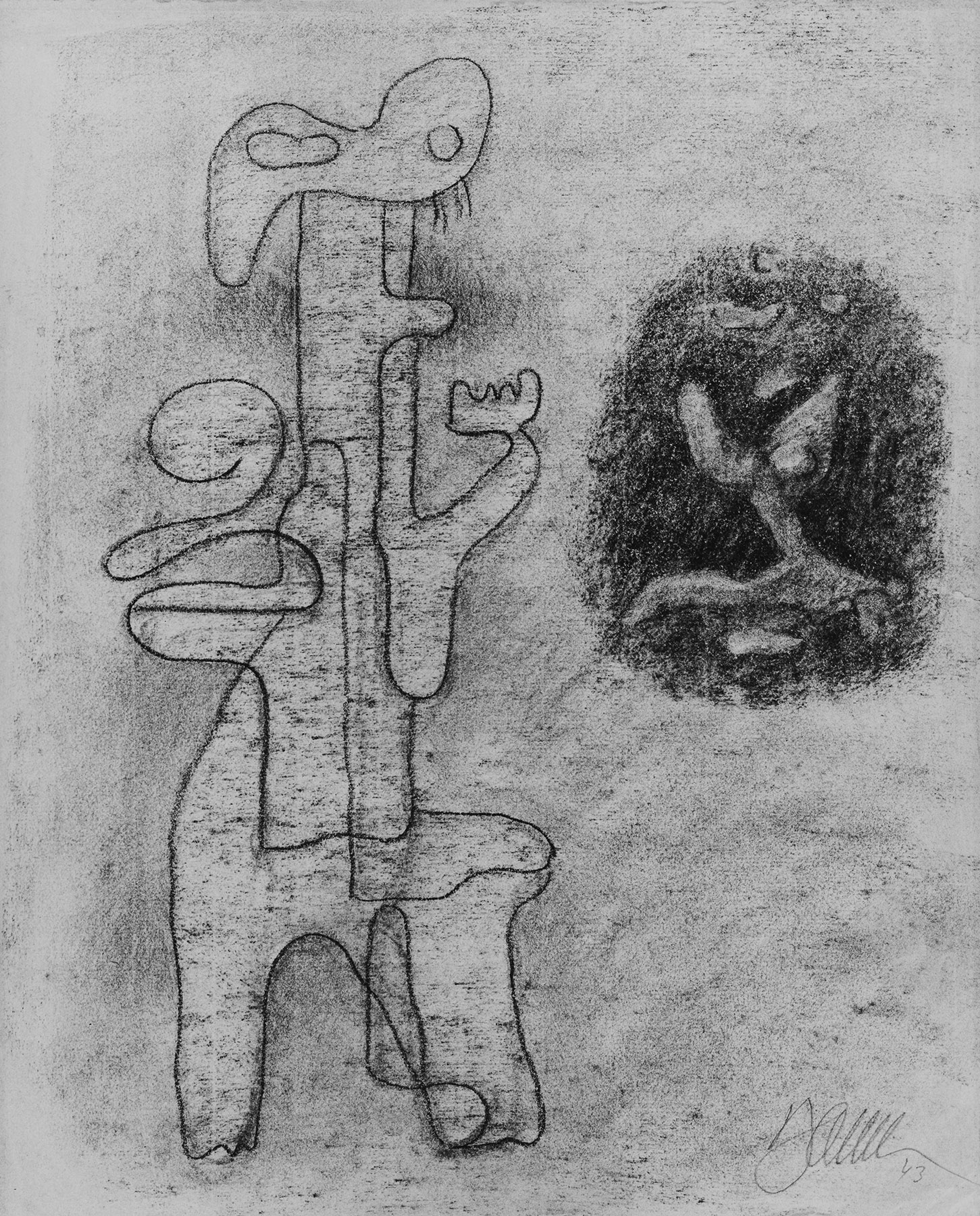 Kohle, gewischt, Ölkreide in Blau, Orange, Rot, fixiert, auf rosafarbigem, am Rand u. besonders r. unregelmäßig gerissenem Ingres-Bütten