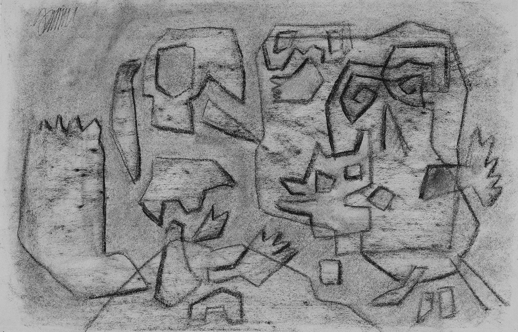 Kohle, gewischt, Pastell in Ocker, Braun, fixiert, auf chamois- bis beigefarbigem Ingres-Bütten