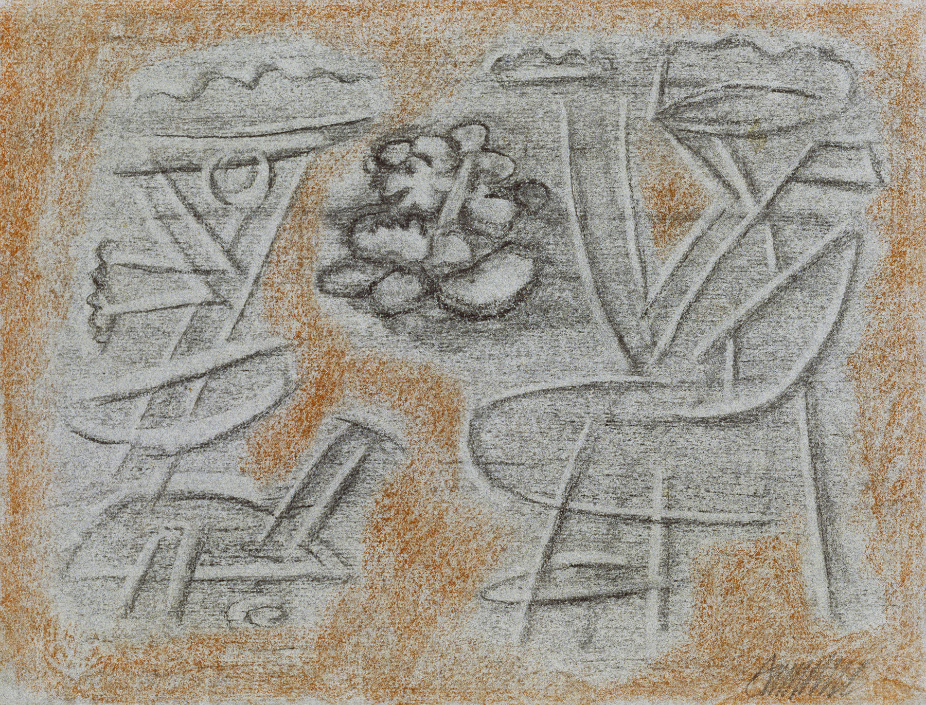 Kohle, gewischt, radiert, Pastell in Ziegelrot, fixiert, auf blaugrauem Ingres-Bütten mit Wz. l. u.: Hahn im Kreis