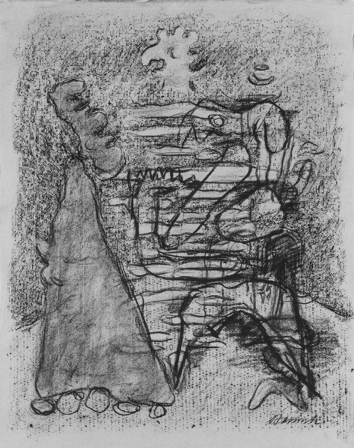 Kohle, z. T. gewischt, Ölkreide in Rot, Grün, Violett, Gelb, Ocker, Ölkreide in Schwarz durchgerieben, Ritzkonturen, fixiert, auf lichtblauem Ingres-Bütten mit Wz. l. o.: INGRES
