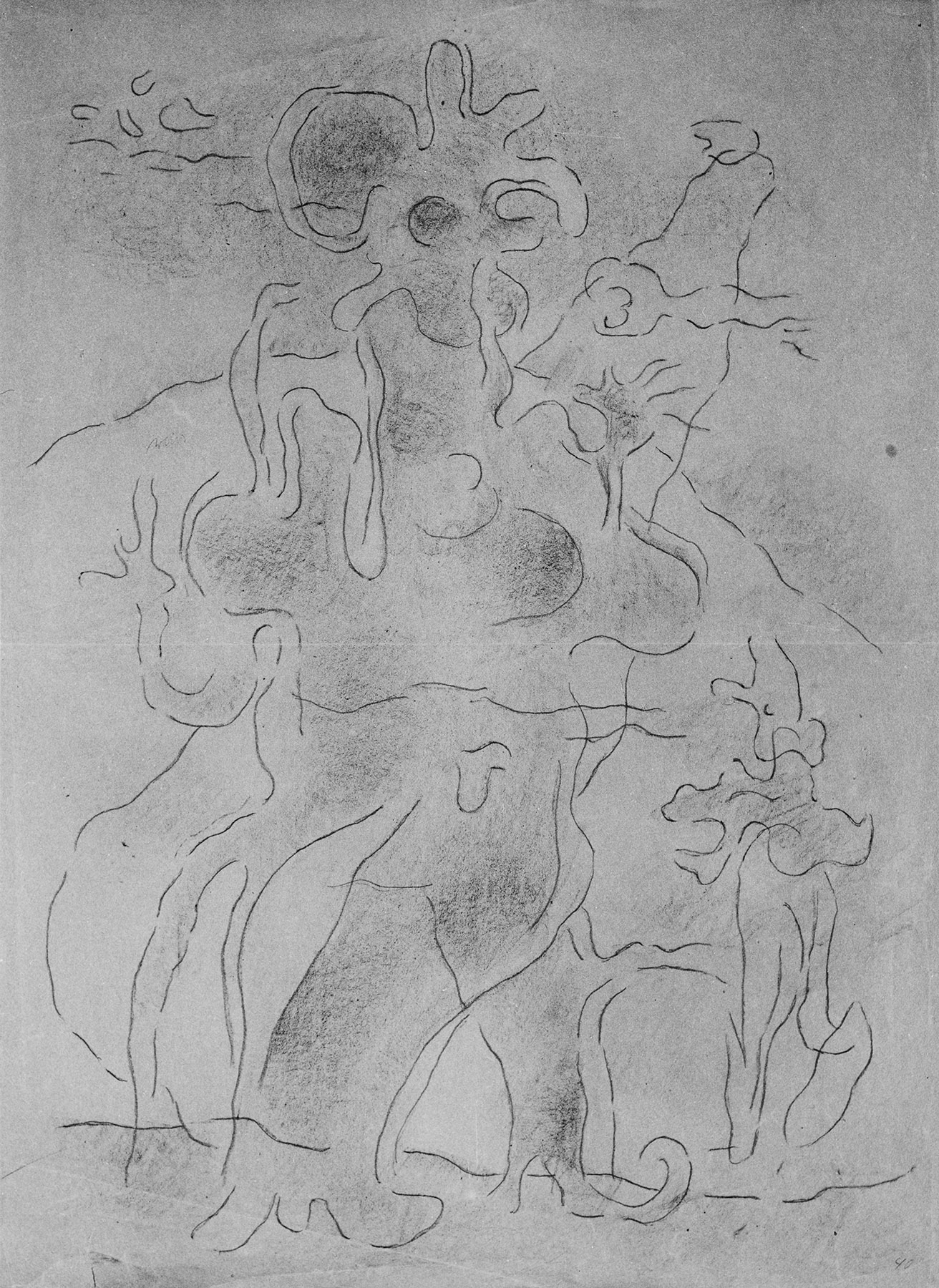 Vgl. das 1940 datierte Gemälde G 589. Die gleichen Maße und die Unregelmäßigkeiten des gepausten Striches sprechen für eine direkte Übertragung vom Bild.