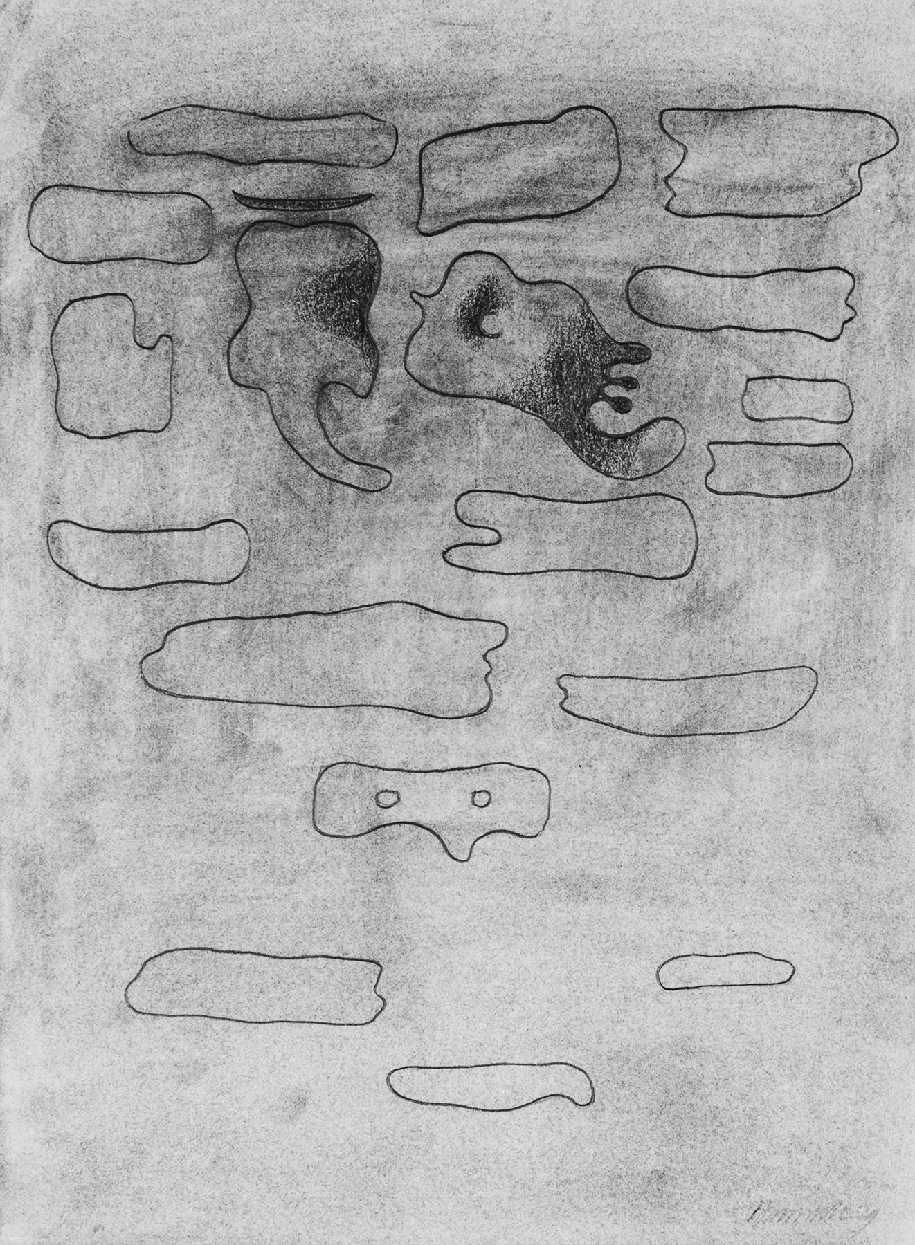 Kohle, gewischt, Bleistift, Konturen vorgeritzt (gepaust?), mit stumpfem Gegenstand (Pinselstiel) z. T. gepaust, fixiert, Einfassungslinien, auf chamoisfarbigem, am Rand l. perforiertem Zeichenkarton.
