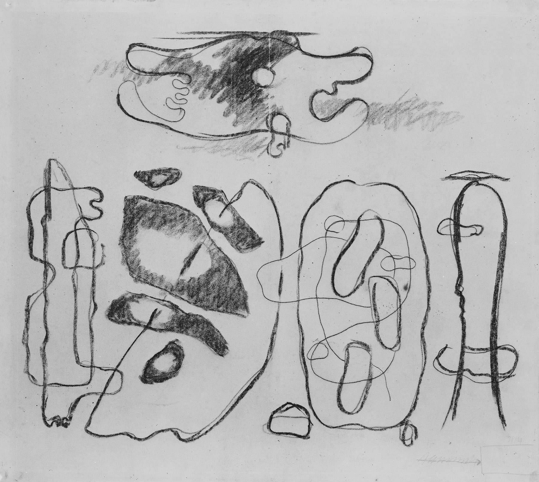 Vgl. das von B. 1939 datierte Gemälde G 598. (fkb) 723-727: Die Blätter zeigen „Eidos“-Kompositionen, verbunden mit landschaftlichen Elementen und sich überlagernden Formkompartimenten, wie sie ebenfalls in den Jahren 1937/38 entwickelt wurden. Ähnlich wie bei den Blättern der Gruppe Z 676-679 sind auch hier Kompositionsideen festgehalten, die den Versuch zeigen, mit den vorhandenen Elementen durch eine veränderte Kombination zu Neuem vorzustoßen. Obwohl dieser Absicht kein Erfolg beschieden war, sind die Handskizzen dennoch von B. zur Dokumentation aufbewahrt worden. Dieser Typus von Zeichnungen ist im Nachlaß häufig vorhanden. Die Einordnung der Blätter ist schwierig, weil sie sich entweder nicht oder nur schwer mit ausformulierten und fertigen Arbeiten verbinden lassen.