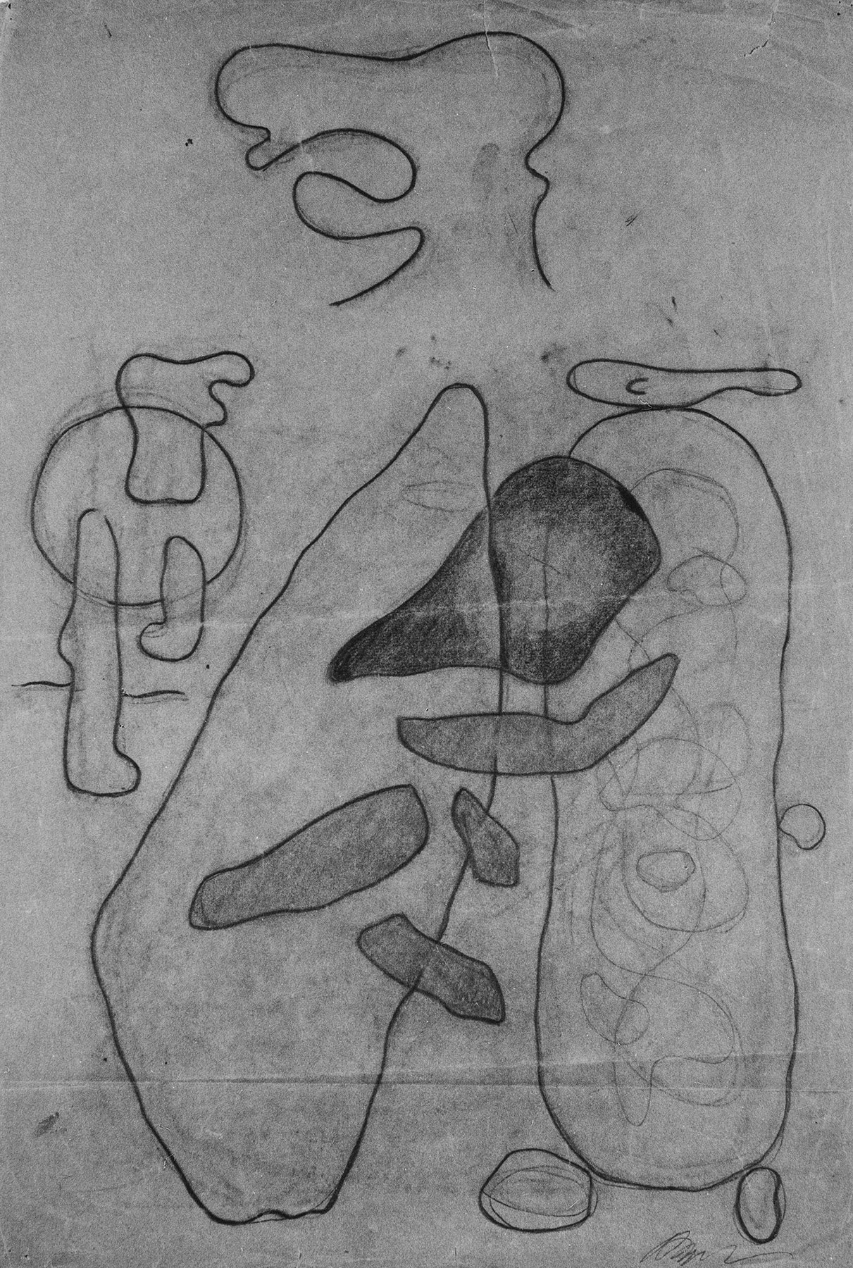 Kohle (Vorzeichnung, mit Abweichungen), Bleistift, Ölkreide in Rot, Deckfarbe in Rot, Konturen z. T. stark durchgedrückt, auf olivgrünem Tonpapier