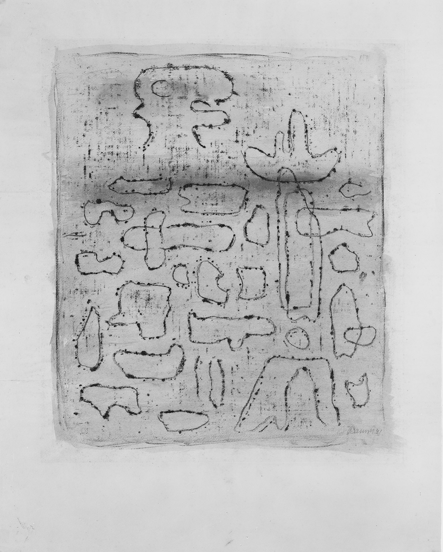 Das Blatt ist im Durchreibeverfahren nach einem Ölbild entstanden. - Vgl. das von B. auf Foto 1940 datierte, vernichtete Gemälde, nicht bei G, Foto im Archiv Baumeister. (fkb) Die Divergenz der Datierungen ist nicht aufgeklärt.