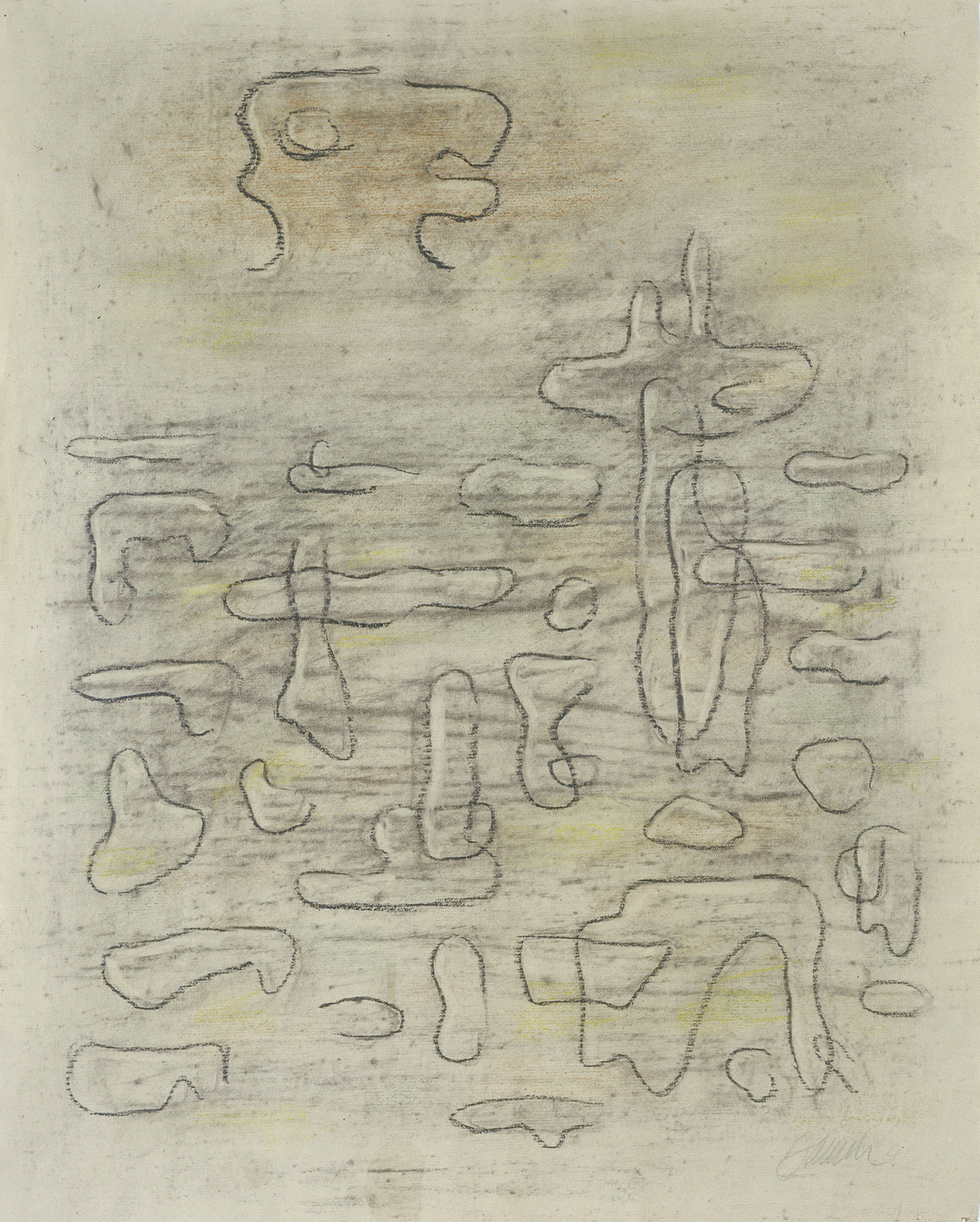 Kohle, Durchreibung in Kreide in Schwarz, Kreiden in Orange, Gelb, Grün, Einfassungslinie in Bleistift, auf hellbeigefarbigem Papier
