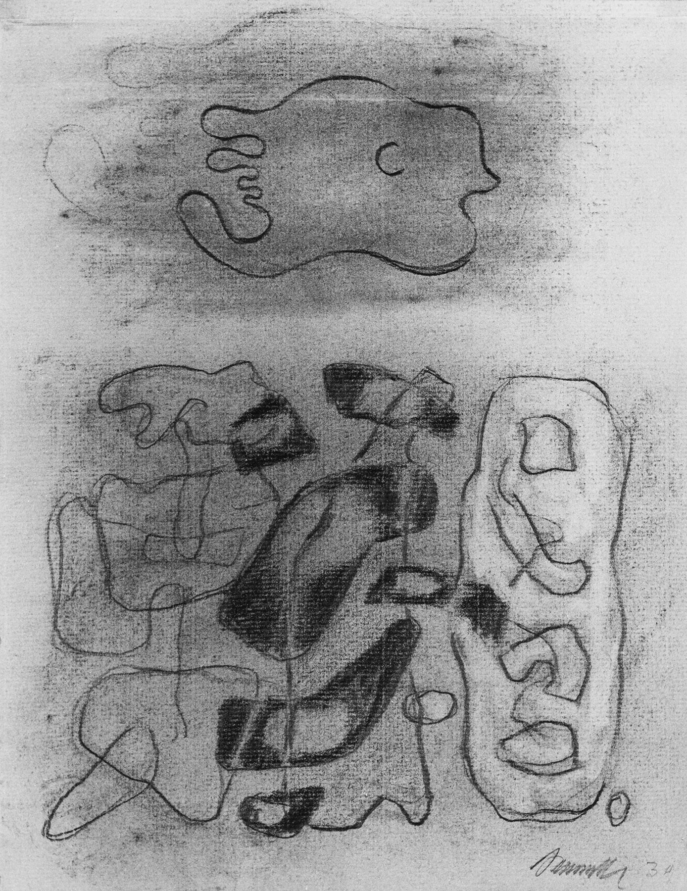 Kohle, gewischt, radiert, Bleistift, Ölkreide in Rot, Orange, Blau, Violett, fixiert, Einfassungslinie am Rand o., auf lindgrünem Ingres-Bütten mit Wz. l. u.: Steigender Löwe