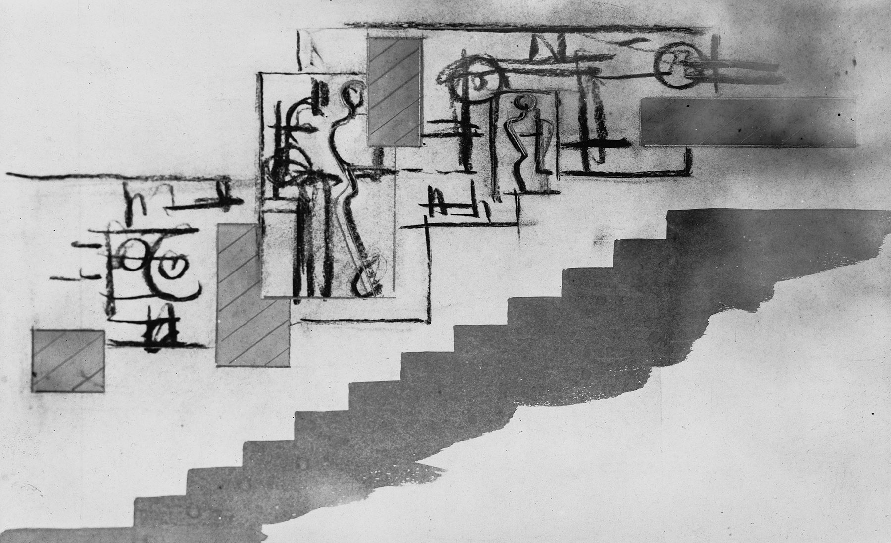Entwurf für ein Wandbild im Treppenhaus einer Schule in Frankfurt a. M., deren Architekt Stadtbaurat E. May gewesen sein soll. Vgl. die Abbildung (nach beschnittener Vorlage) eines früheren Zustandes bei Grohmann, 1963, Nr. 1697.