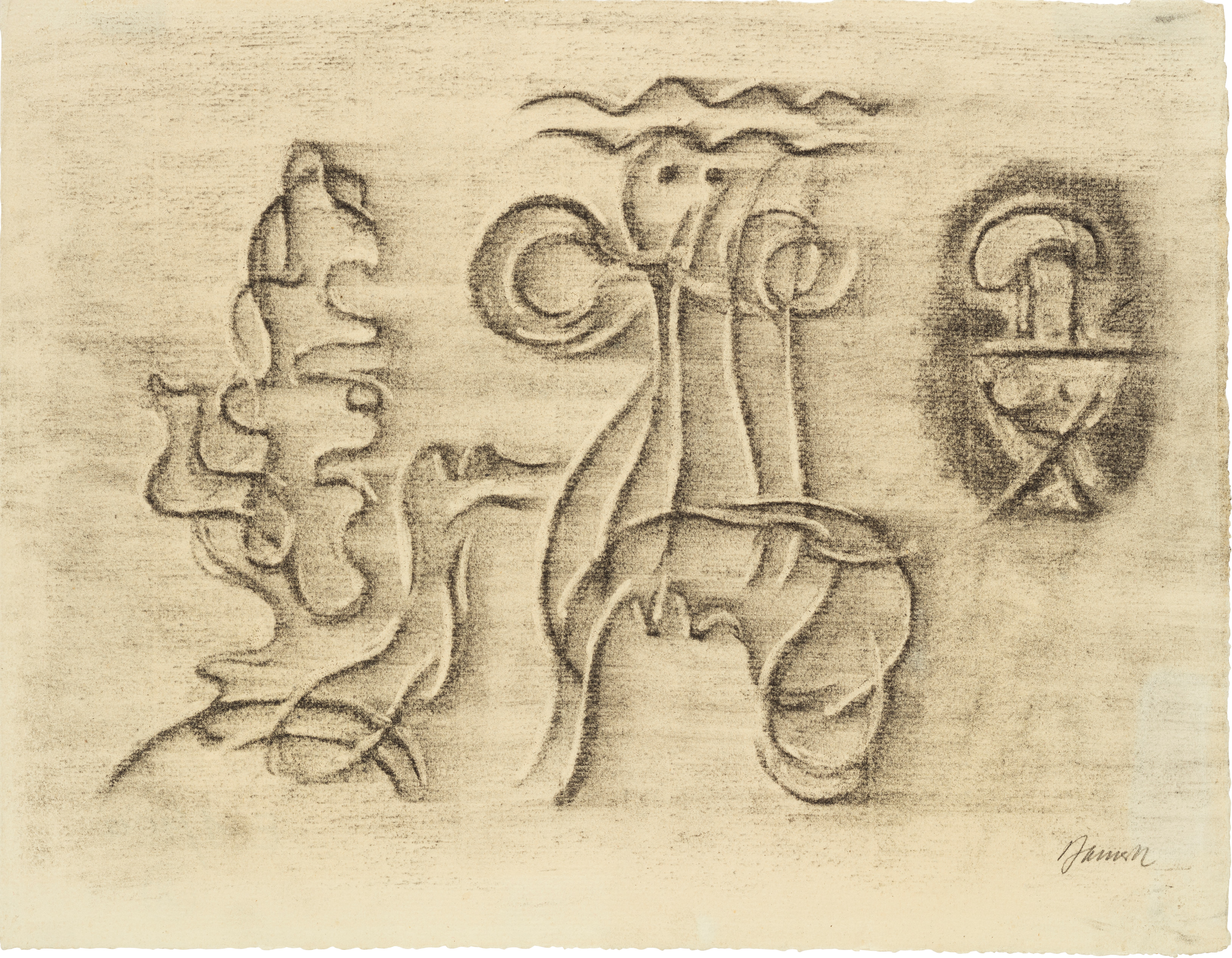 Kohle, gewischt, radiert, fixiert, auf chamoisfarbigem Ingres-Bütten