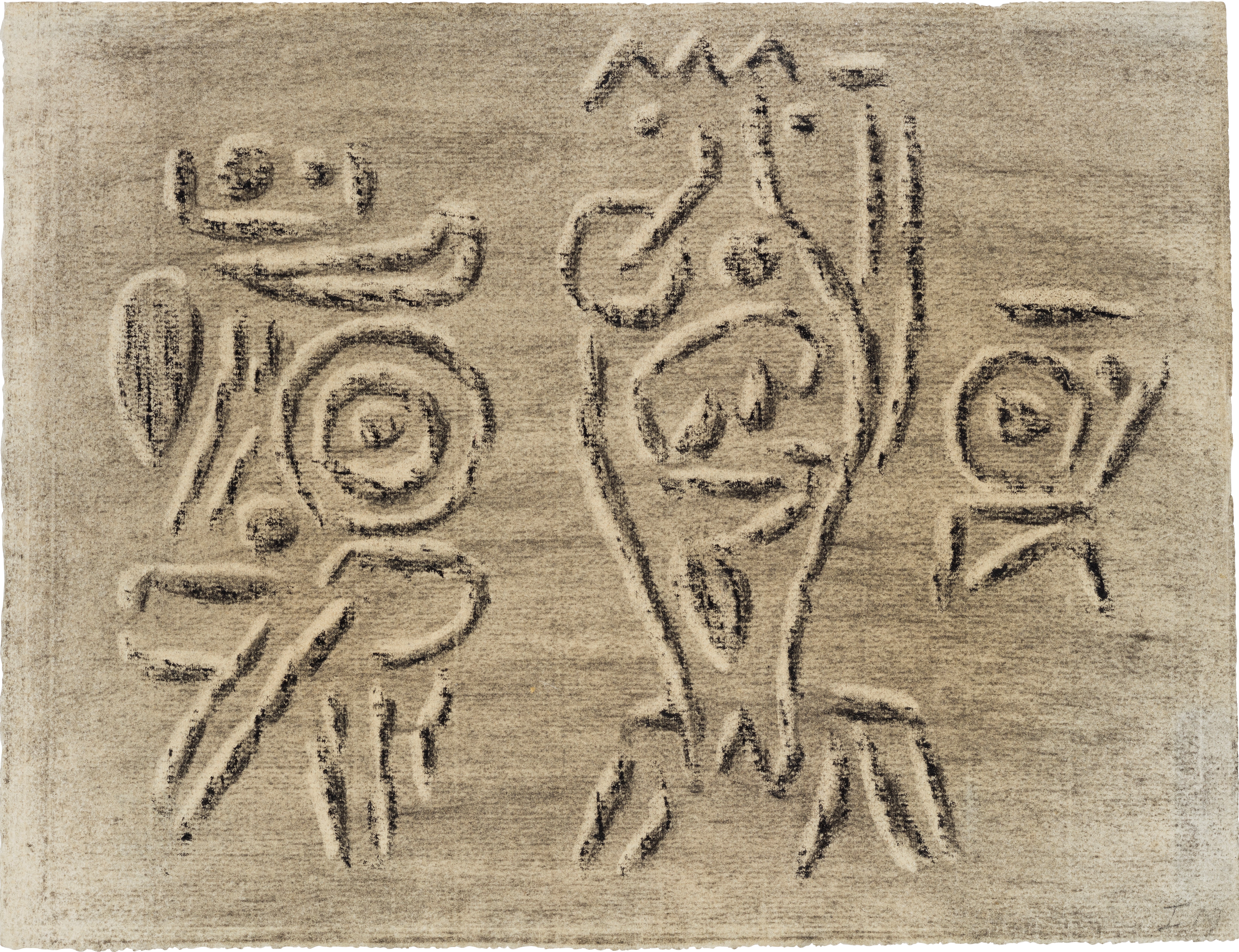 Kohle, gewischt, radiert, Ölkreide in Schwarz, fixiert, auf chamoisfarbigem Ingres-Bütten