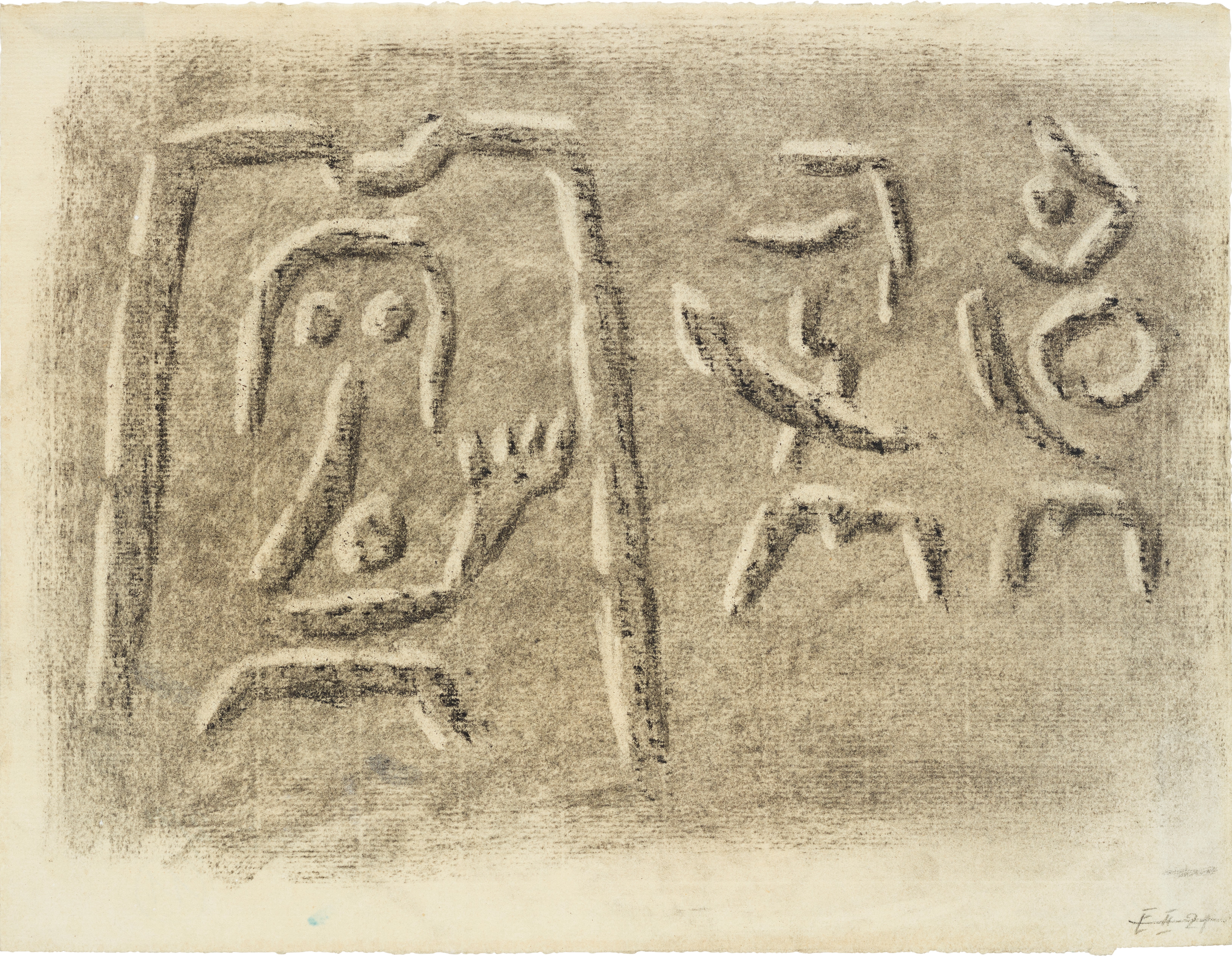 Kohle, gewischt, radiert, Ölkreide in Schwarz, fixiert, auf chamoisfarbigem Ingres-Bütten