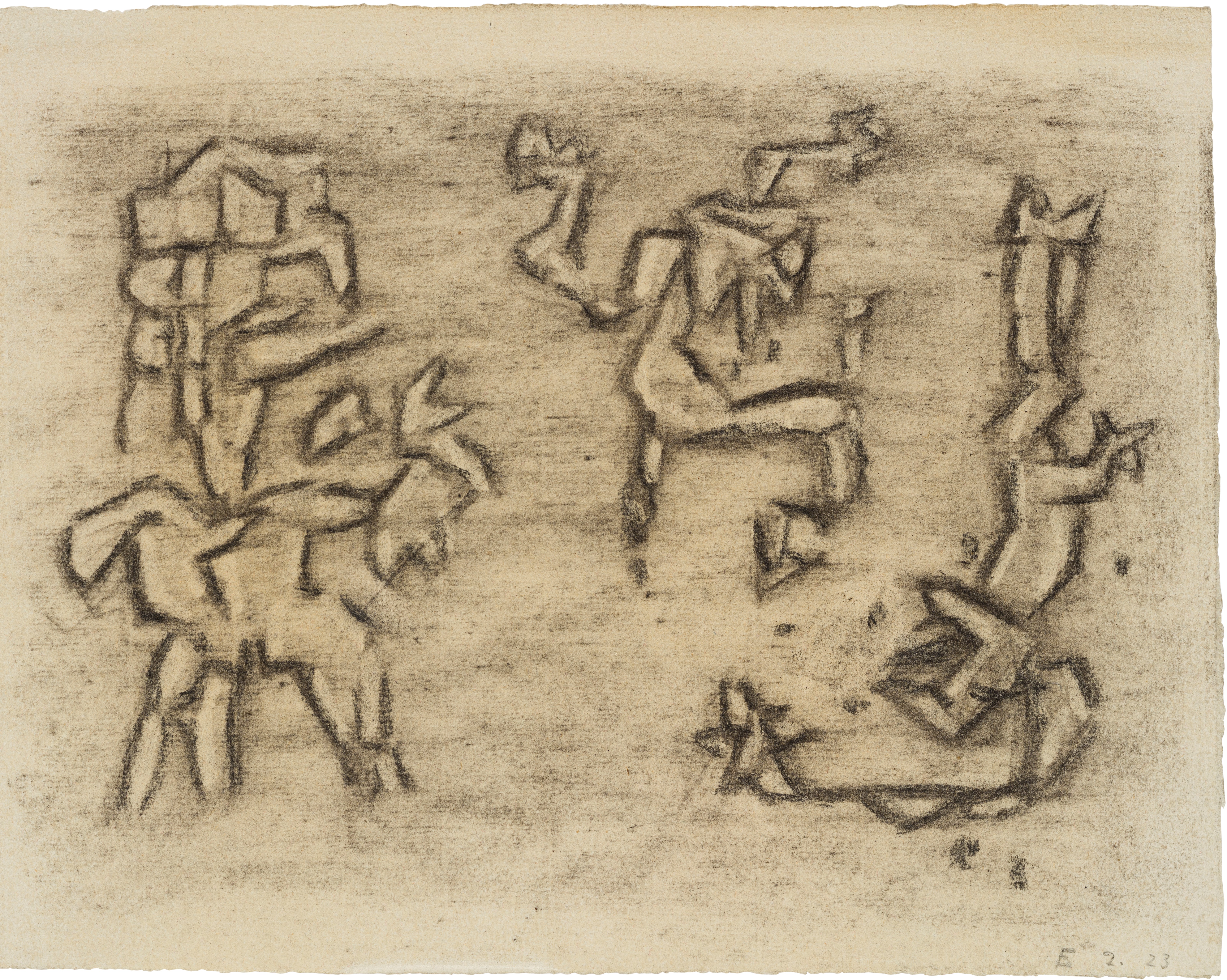Fixativ durchgeschlagen nach verso, verso an den Ecken r. o., l. o., l. u. Papierfalzreste mit Klebstoff.