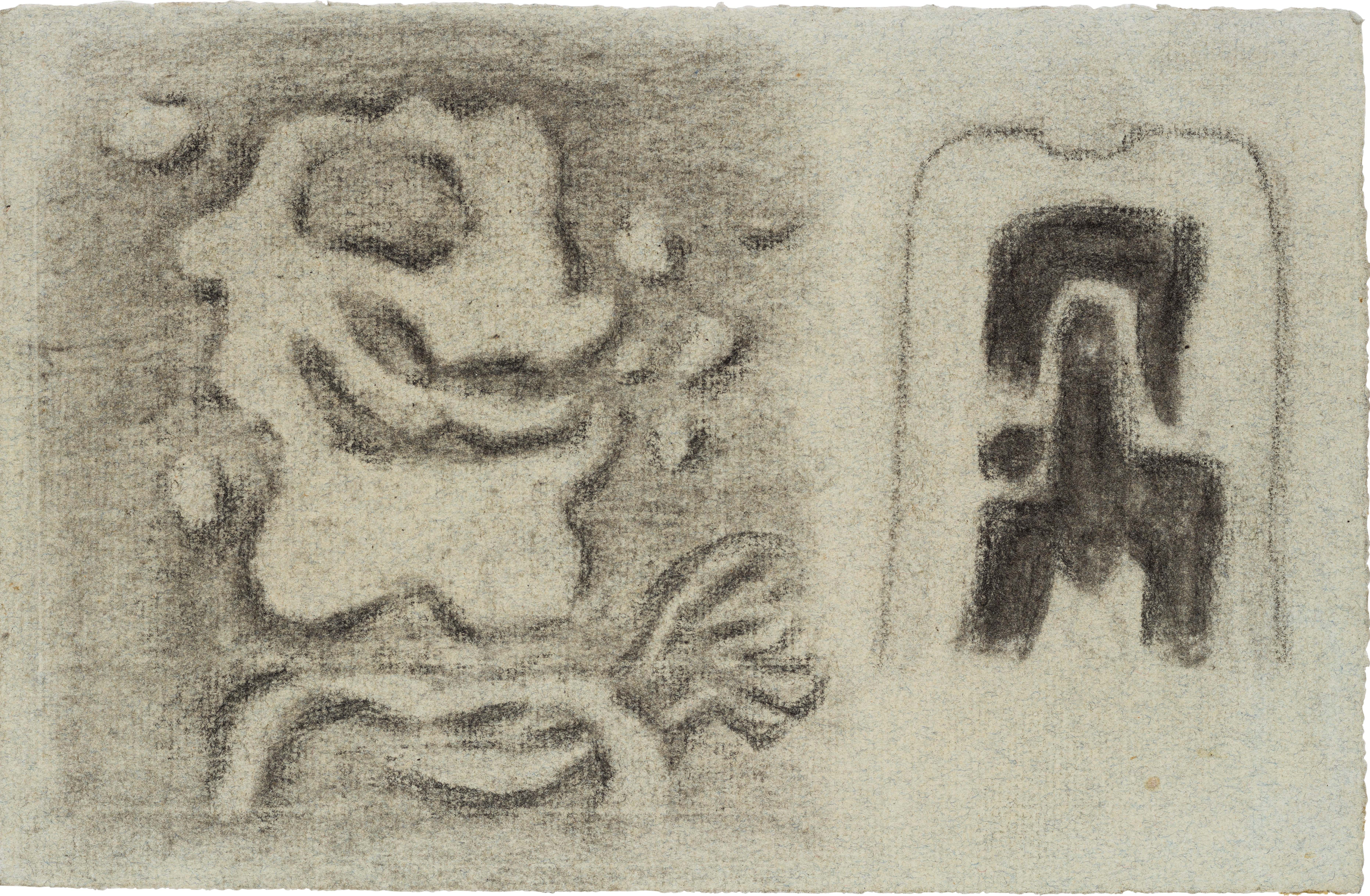 Kohle, z. T. gewischt, fixiert, auf lichtblauem Ingres-Bütten