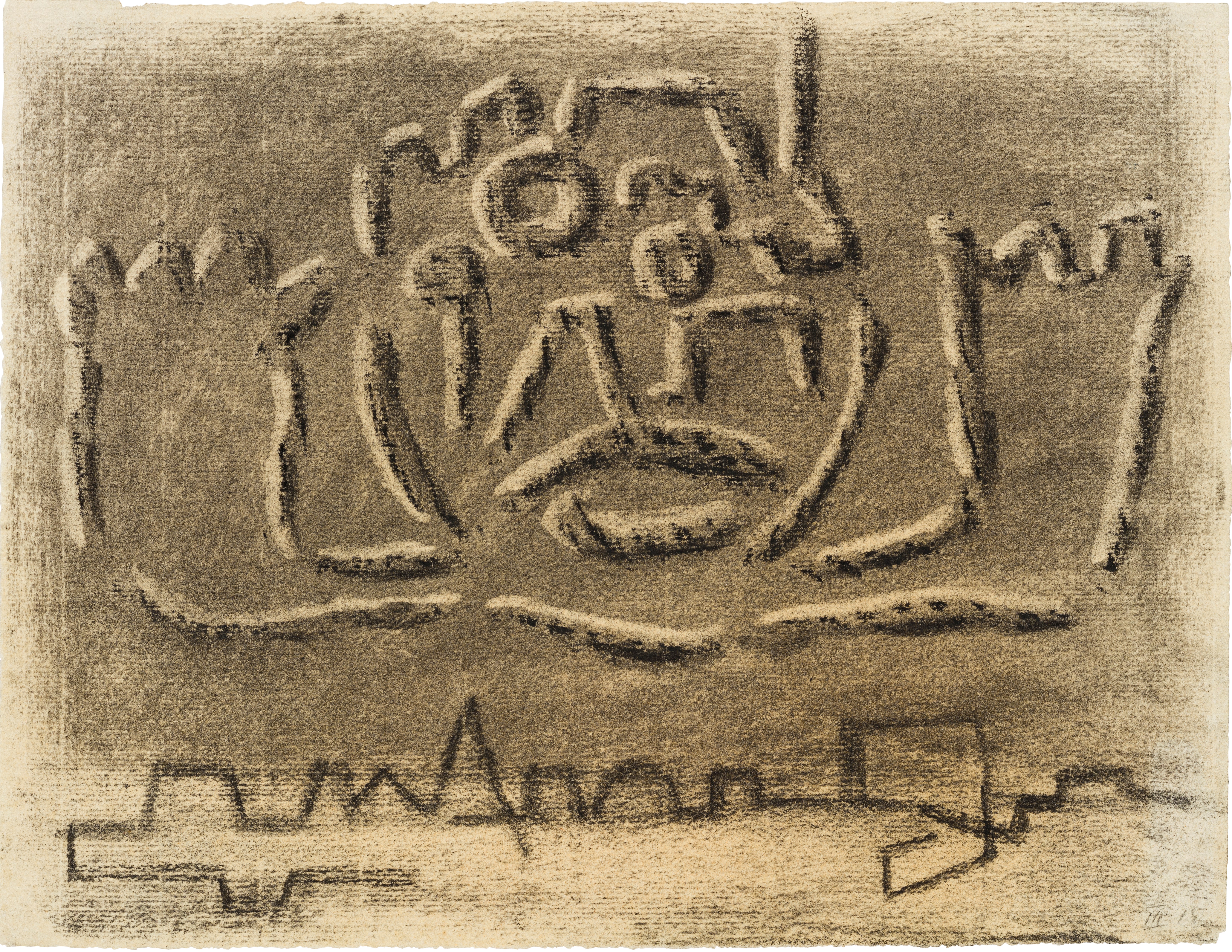 Kohle, gewischt, radiert, Ölkreide in Schwarz, fixiert, auf chamoisfarbigem Ingres-Bütten