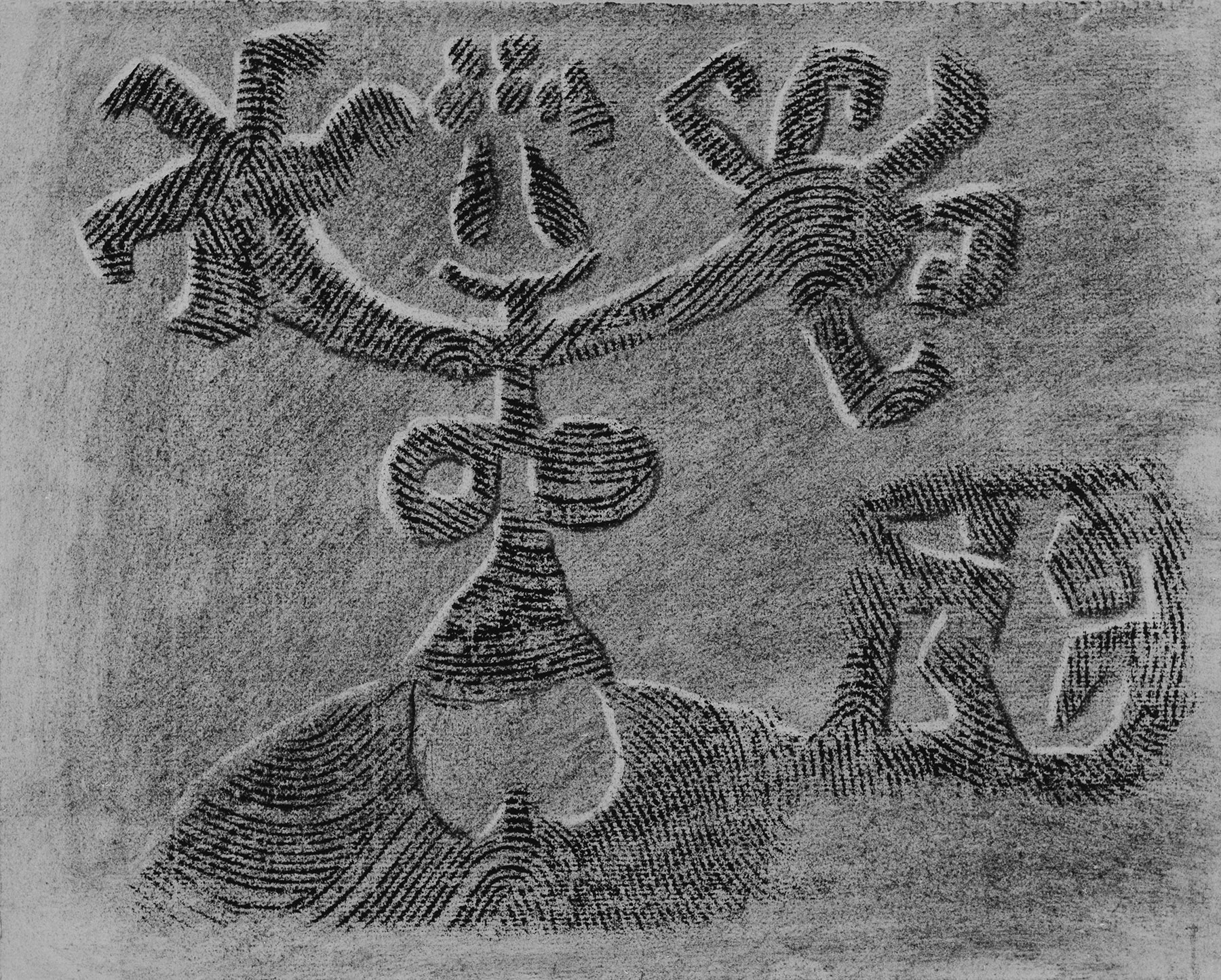 Kohle, gewischt, radiert, Ölkreide in Schwarz, durchgerieben, fixiert, auf chamoisfarbigem Ingres-Bütten