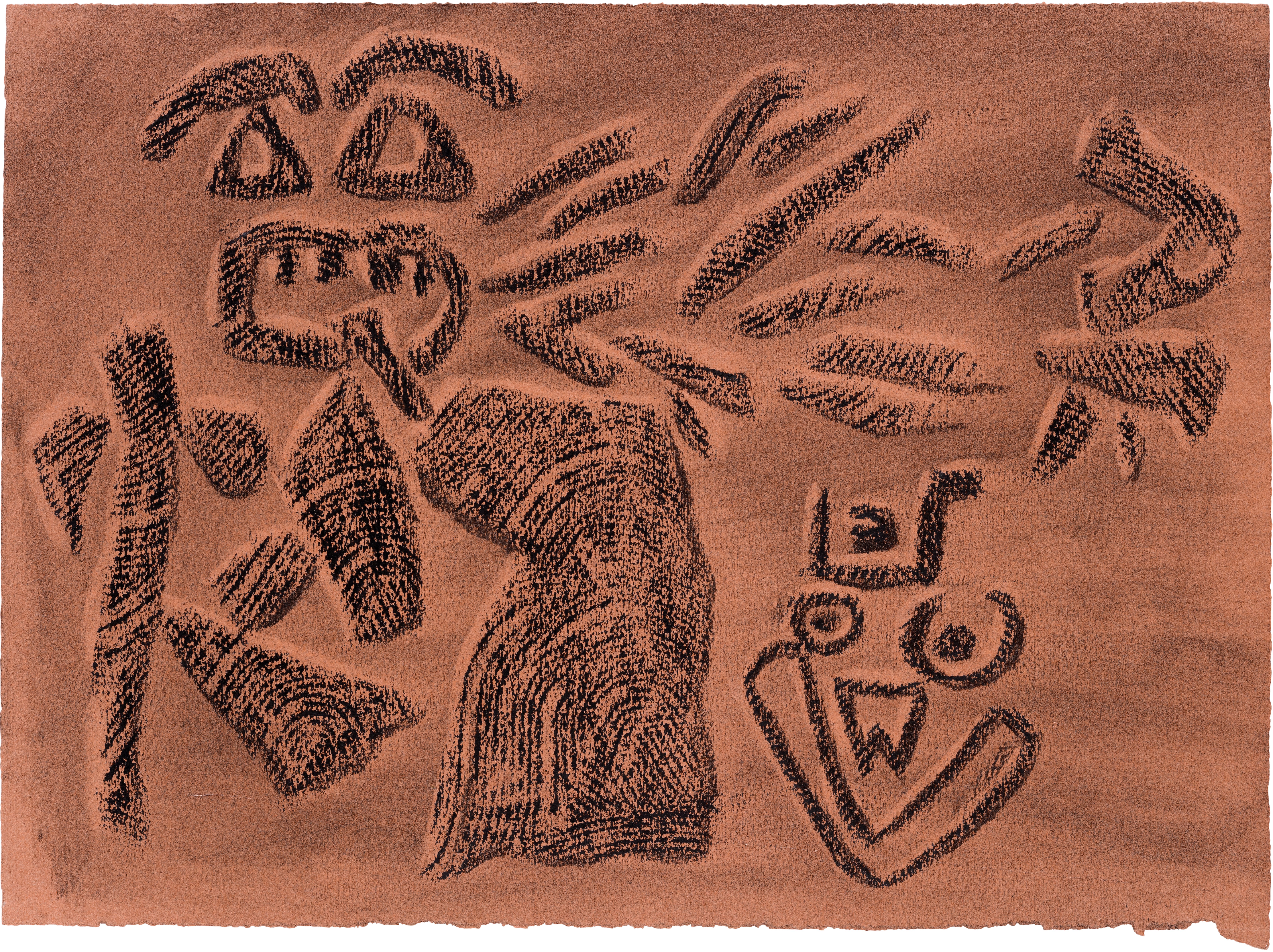 Kohle, gewischt, radiert, fixiert, Ölkreide in Schwarz, durchgerieben, auf ziegelbraunem, am Rand u. leicht unregelmäßig im scharfen Knick abgetrenntem Ingres-Bütten