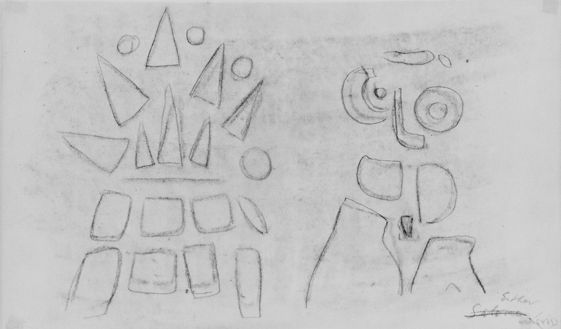 Kohle, Bleistift, Konturen mit Druck übergangen (verso zum Übertragen der Komposition mit Kohle geschwärzt), auf dünnem, chamoisfarbigem, am Rand r. perforiertem Transparentpapier