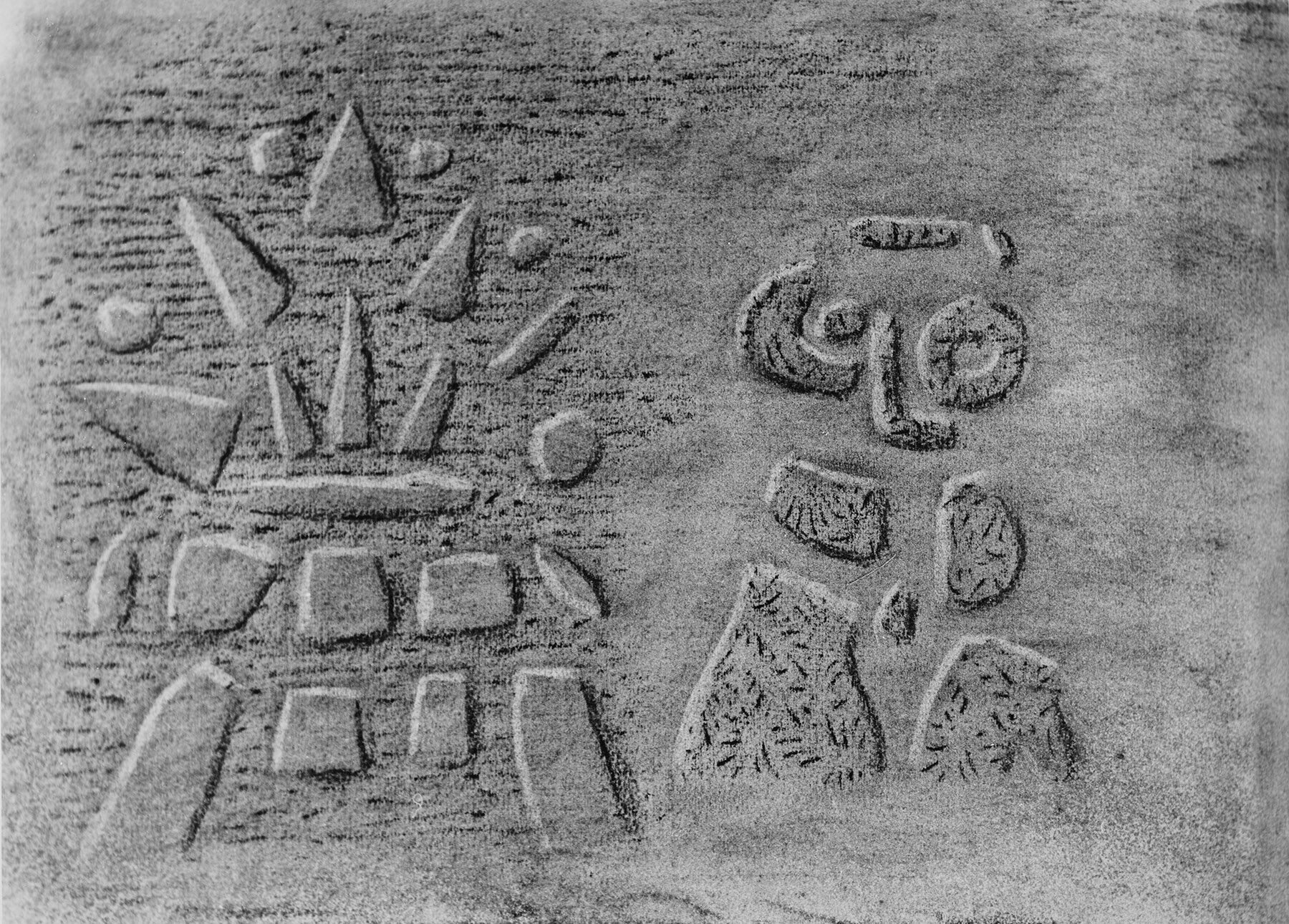 Kohle, gewischt, radiert, Ölkreide in Schwarz, durchgerieben, fixiert, auf rotbraunem Ingres-Bütten