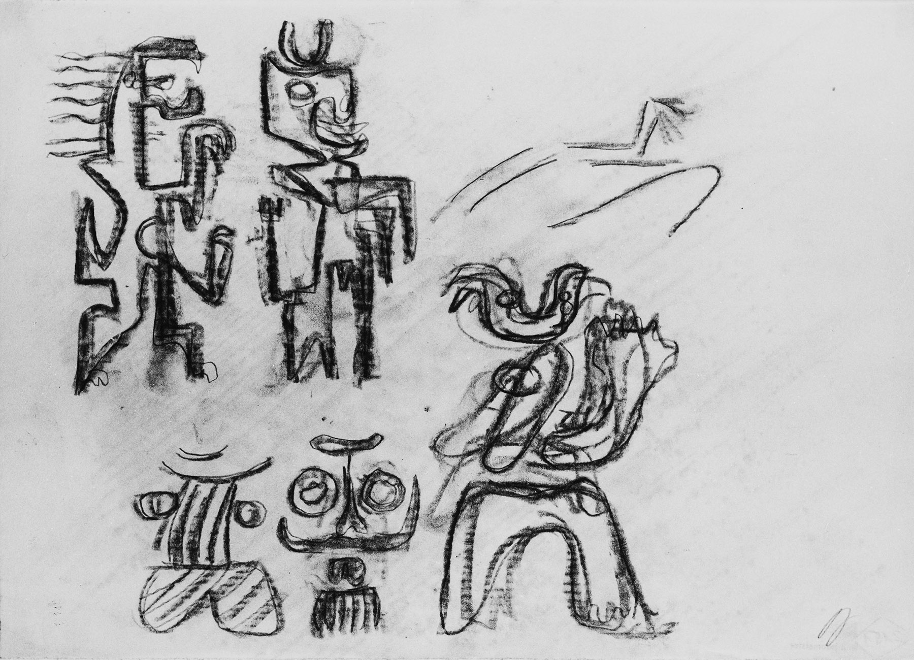 Kohle, Bleistift, auf chamoisfarbigem, dünnem, durchscheinendem, am Rand u. und l. gerissenem Schreibpapier mit Wz. r.: DYNAMIK . HARTPOST