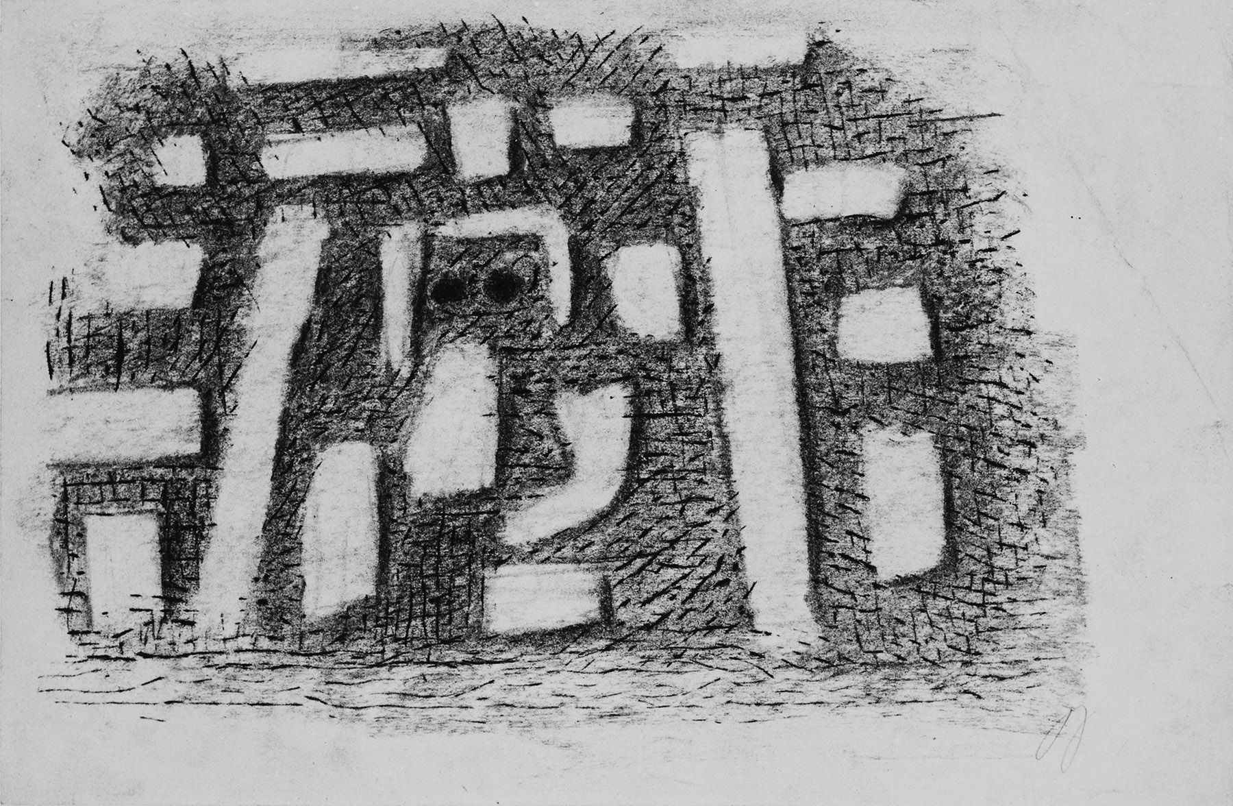 Kohle, gewischt, Ölkreide in Schwarz, durchgerieben, fixiert, auf chamoisfarbigem, am Rand o. unregelmäßig gerissenem Offsetpapier
