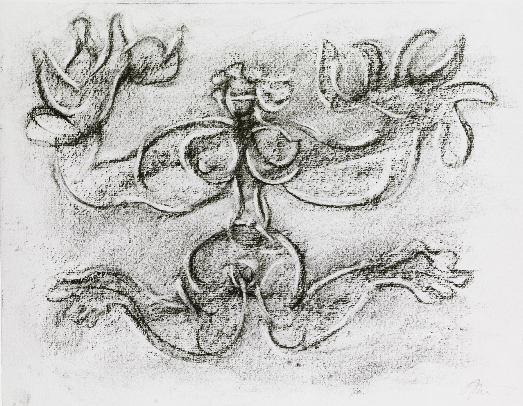 Kohle, gewischt, radiert, fixiert, auf beigefarbigem, am Rand o. im scharfen Knick unregelmäßig abgetrenntem Ingres-Bütten mit Wz. l. u.: INGRES