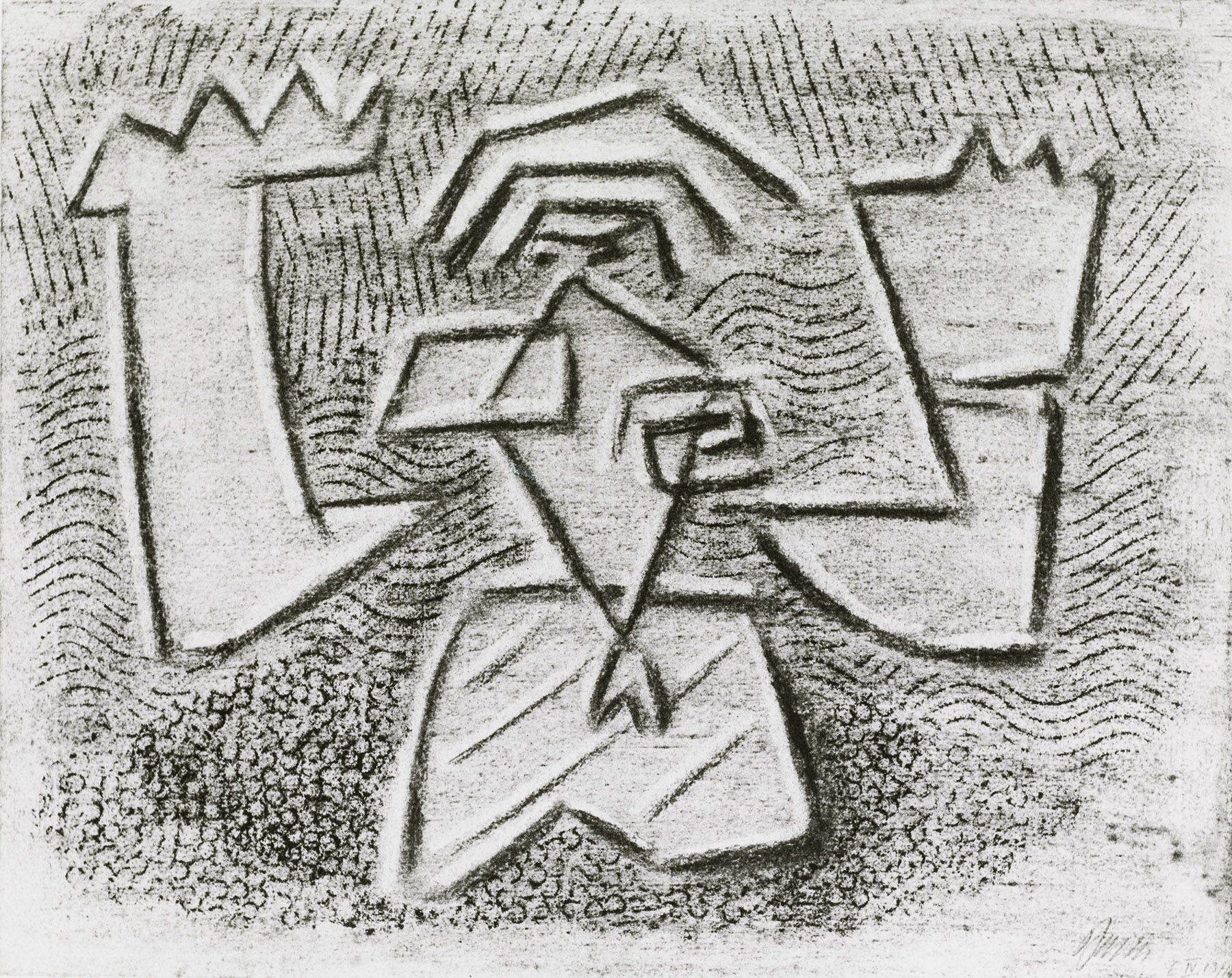 Bräunung durch Fixativ. am Rand r. u. Klebstoff von verso nach recto durchgeschlagen.