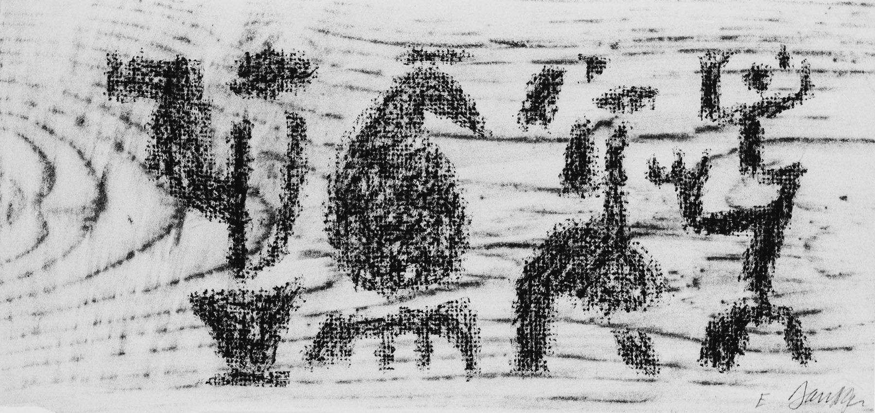 Kohle, gewischt, durchgerieben, Ölkreide in Schwarz, durchgerieben, fixiert, auf chamoisfarbigem, dünnem, am Rand o., l. und u. z. T. unregelmäßig gerissenem Schreibpapier