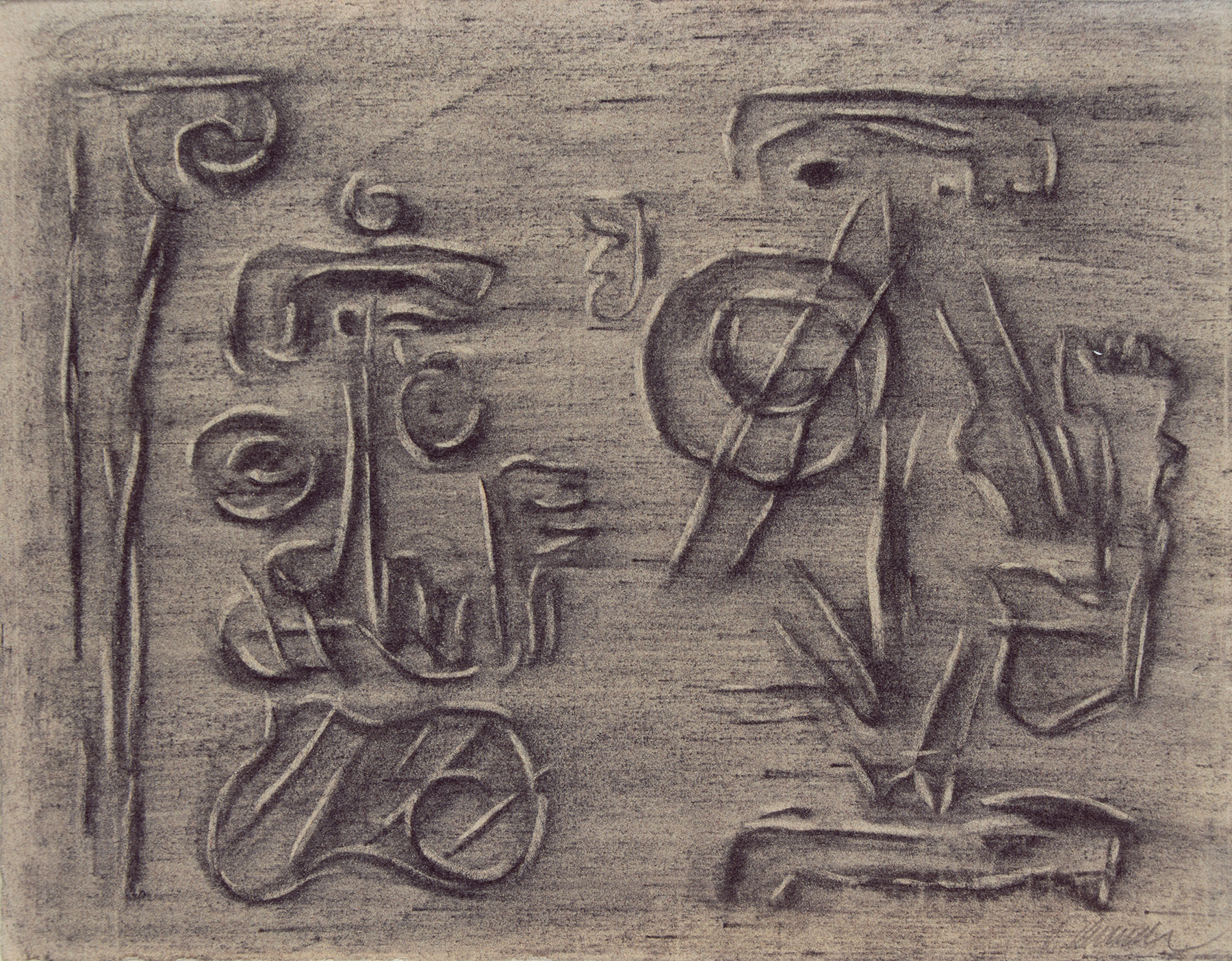 Kohle, gewischt, radiert, fixiert, auf rosafarbigem Ingres-Bütten mit Wz. r. u. : INGRES