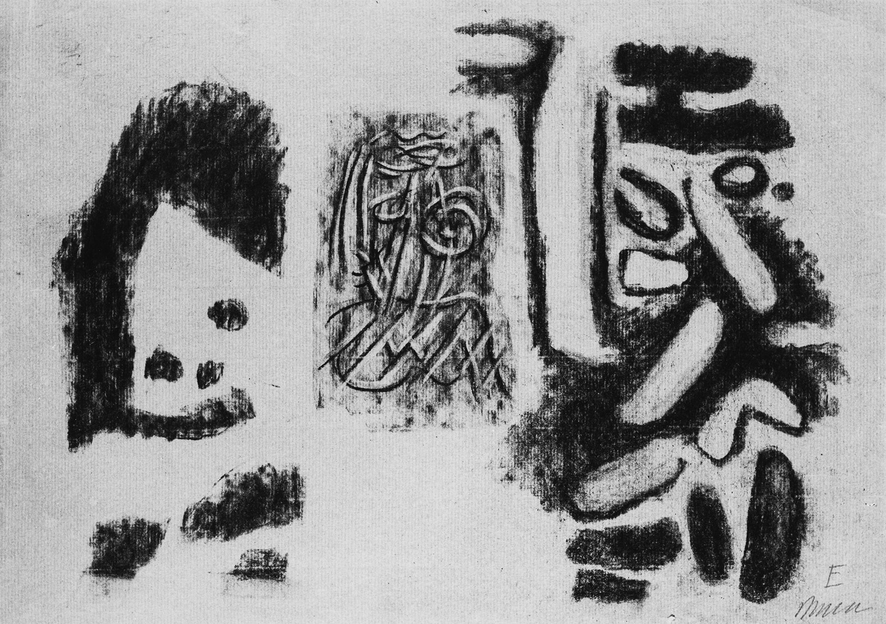 Verknickungen besonders an den Rändern. Rand r. Papier verbräunt. kleines Loch am Rand r. u.. Fixativ durchgeschlagen.