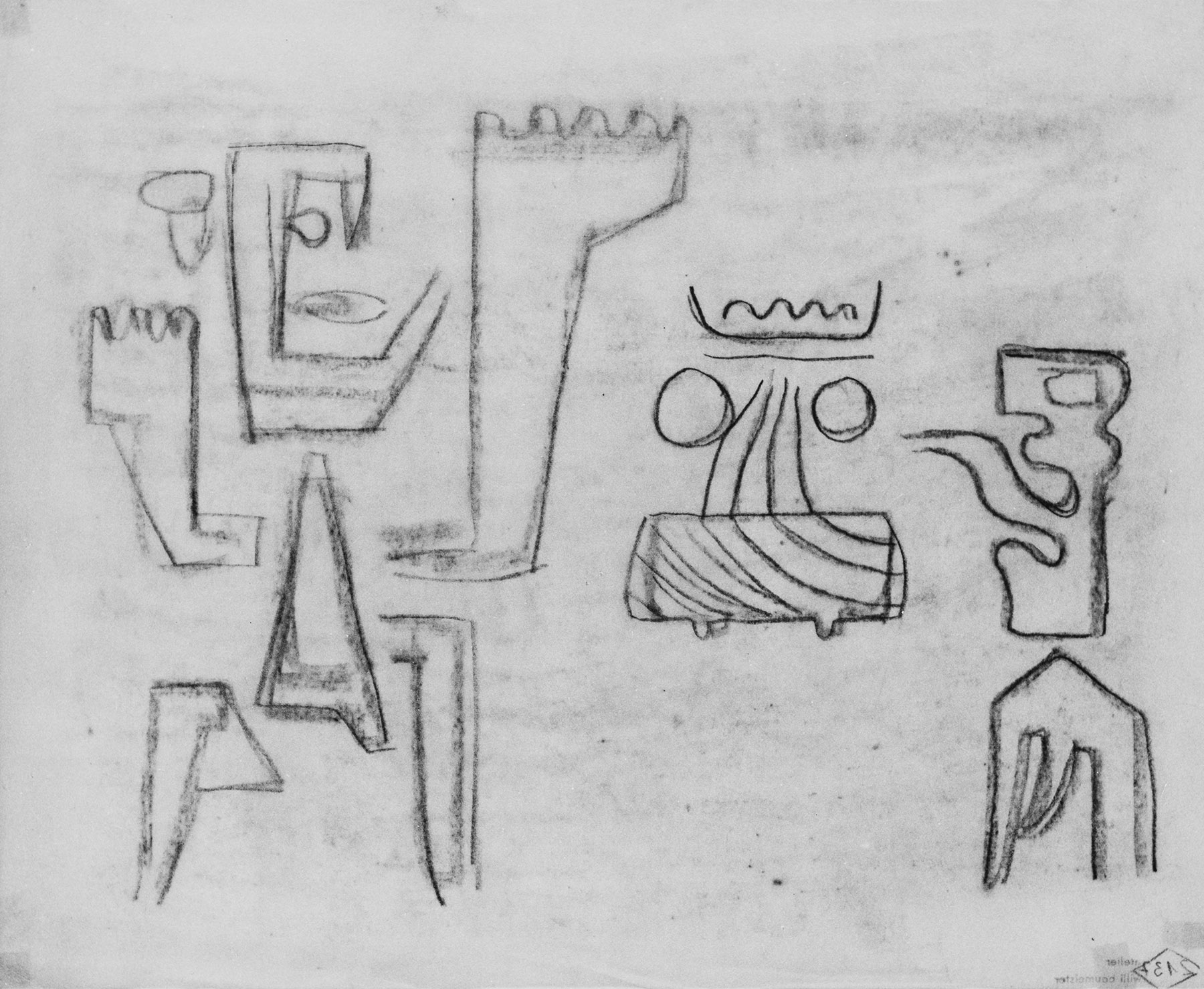 Kohle, Bleistift, auf chamoisfarbigem bis gelblichem, durchscheinendem, am o. Teil des Randes r. perforiertem, am u. Teil leicht schräg nach hinten abgerissenem Pergamentpapier