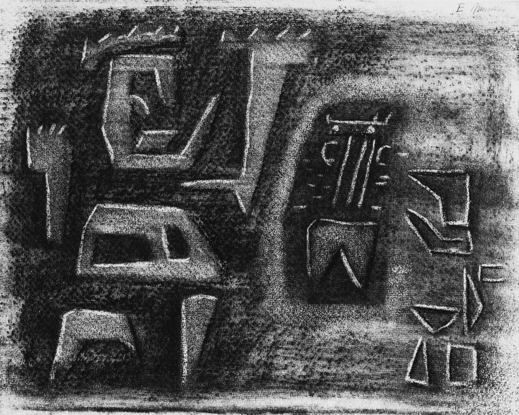 Kohle, gewischt, radiert, fixiert, auf chamoisfarbigem, genarbtem Aquarellpapier