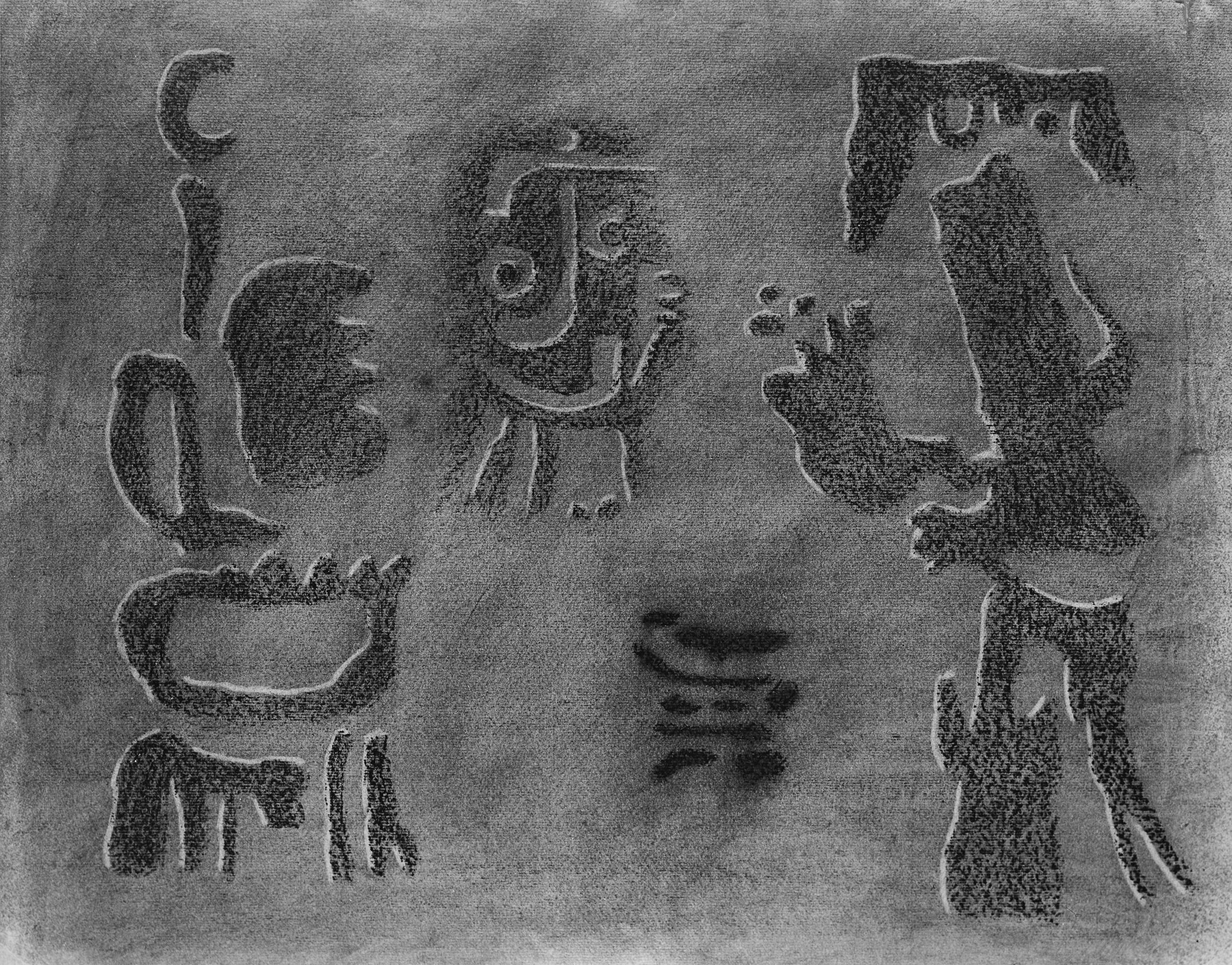 Kohle, gewischt, radiert, Ölkreide in Schwarz, stark fixiert, auf hellbraunem Ingres-Bütten mit Wz. r. u.: INGRES und l. u.: PMF (ITALIA)