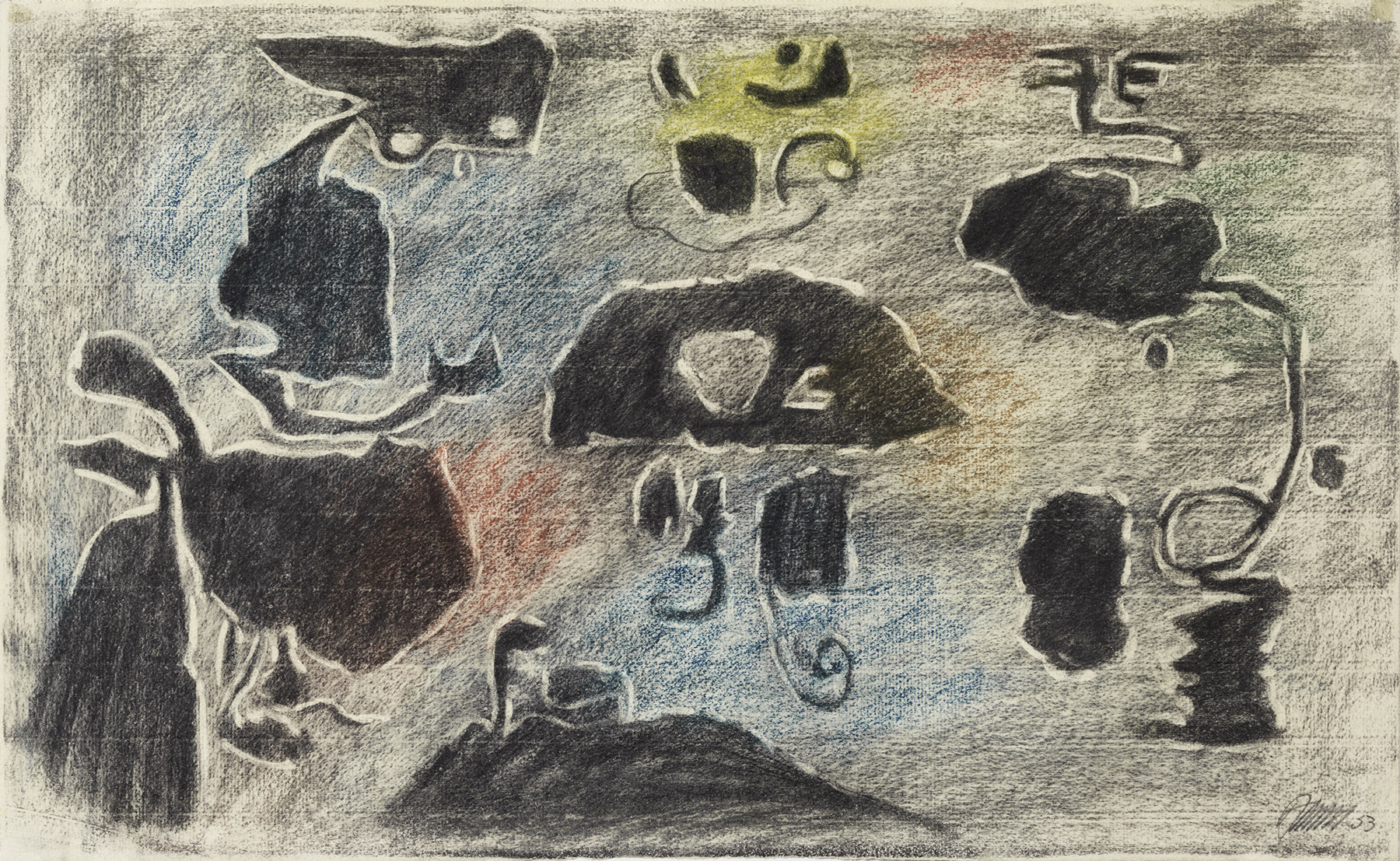 Kohle, gewischt, radiert, Pastell in Rot, Blau, Gelb, Ocker, fixiert, auf chamoisfarbigem, am Rand o. perforiertem Ingres-Bütten