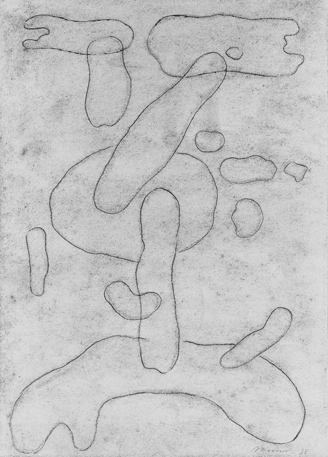 Vgl. das Gemälde G 521 von 1938.   685-697: Einheitliche Gruppe, deren Stil aus der Überlagerung der schwebenden Formen entwickelt worden ist. Linienkompartimente und schwarz ausgefüllte Flächen ergeben ein dichtes Netz ausgewogener, einander bedingender, akzentuierender Elemente.
