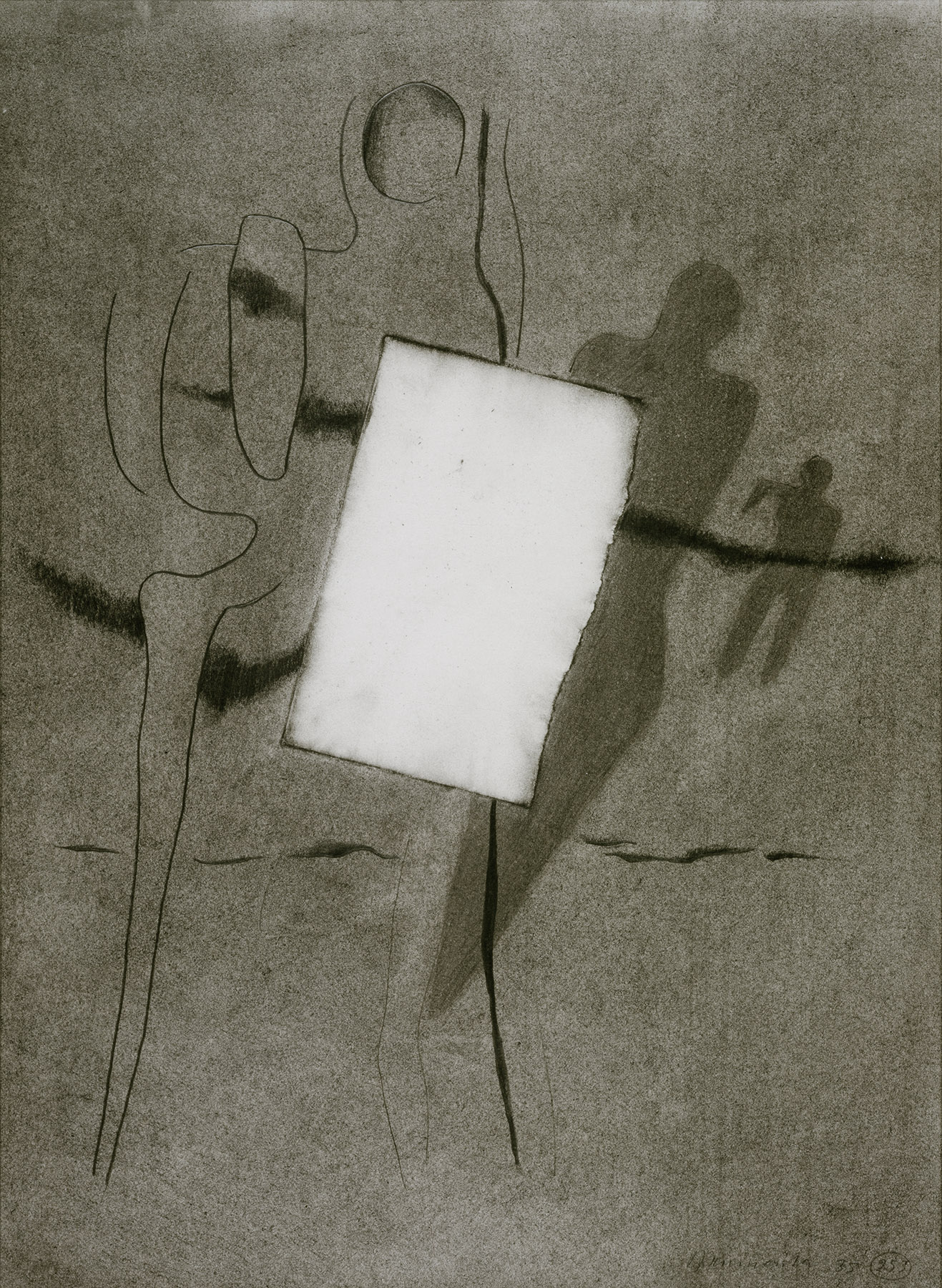 Bleistift, Kohle, gewischt, Konturen vorgeritzt (mit Abweichungen), fixiert, Einfassungslinien doppelt, auf chamoisfarbigem Zeichenkarton, helle Rächenaussparung durch Wischung über ein vorübergehend aufgelegtes rechteckiges Papier