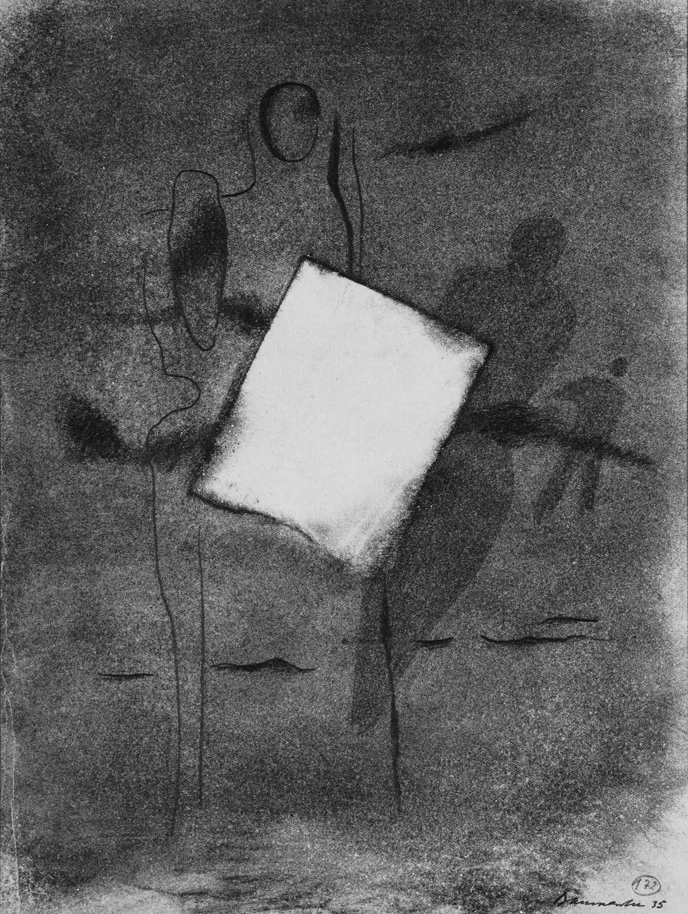 Kohle, gewischt, Bleistift, fixiert, Einfassungslinien, auf chamoisfarbigem Zeichenkarton, zur Aussparung des Rechtecks in der Mitte vor der Wischung mit Papier abgedeckt