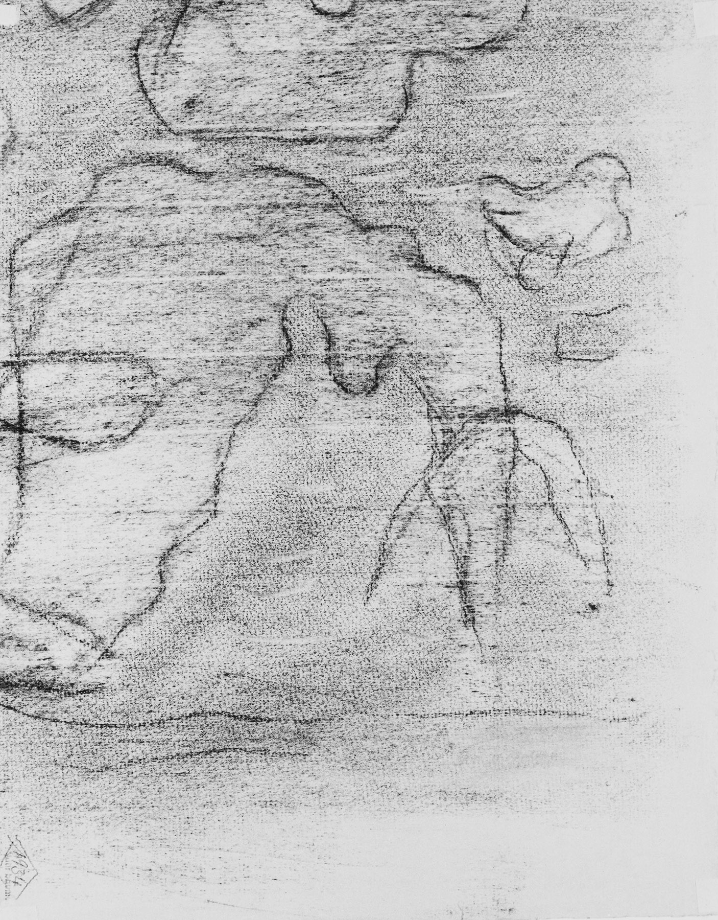 Kohle, Bleistift, Konturen z. T. und mit großen Abweichungen mit starkem Druck übergangen, auf chamoisfarbigem, am Rand u. leicht unregelmäßig gerissenem Ingres-Bütten