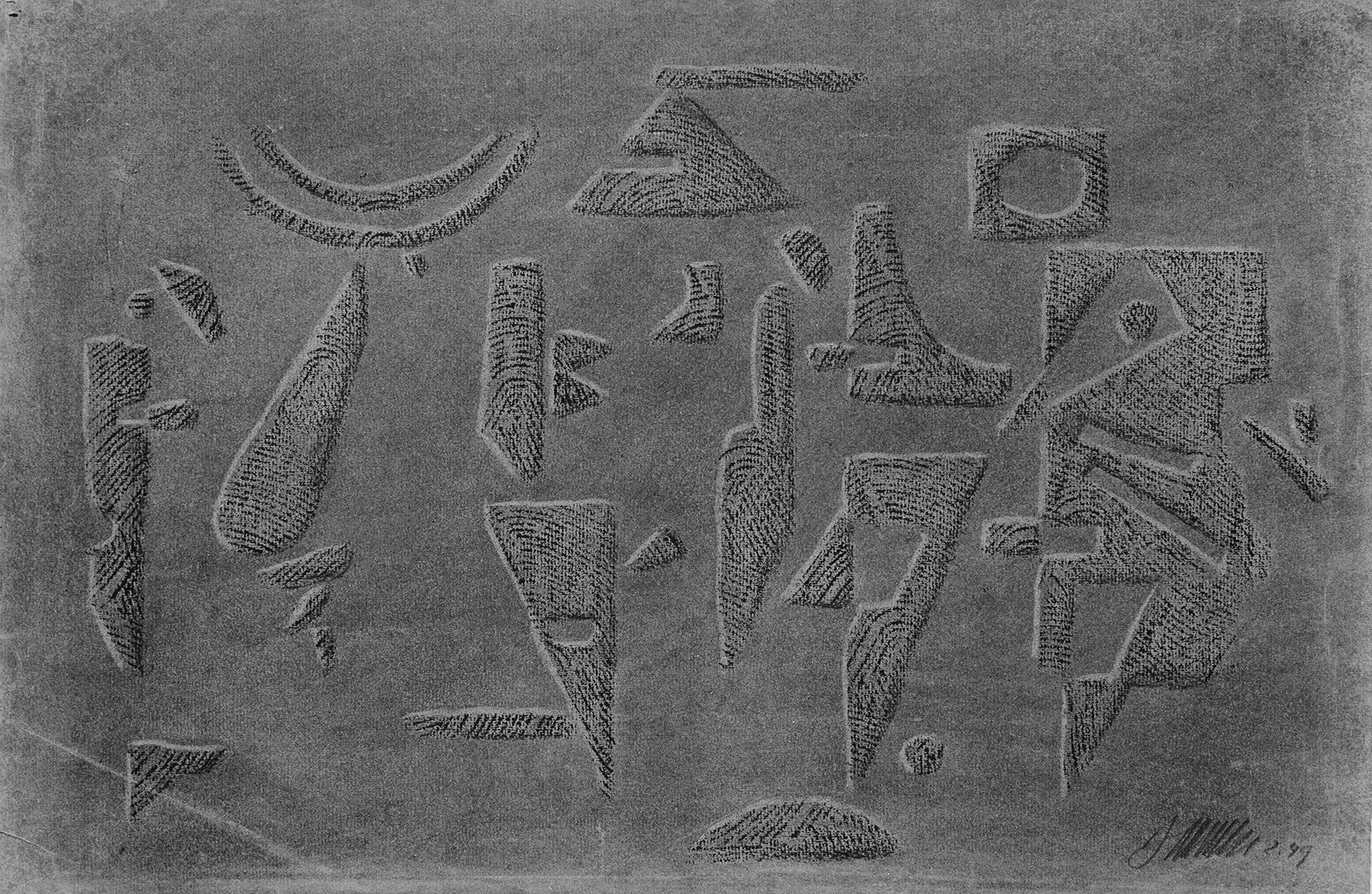 Fixativ stark nach hinten durchgeschlagen. Verknickungen an den seitlichen Rändern. ein scharfer Knick über der Ecke l. u.. ein ca. 20 mm langer Riß im Rand l. an der Ecke u.. parallel zum Rand o. mehrere kleine durchgedrückte Stellen