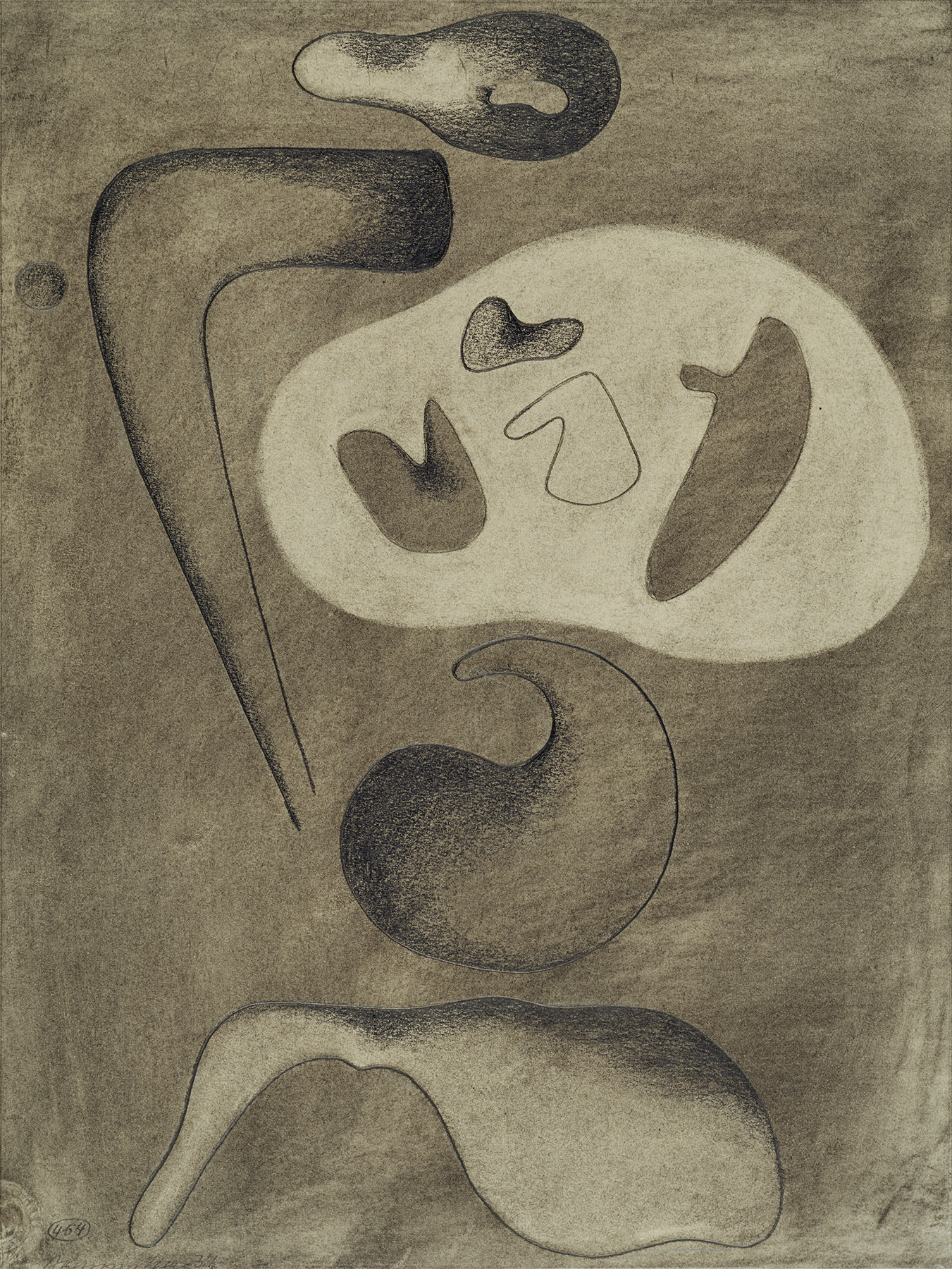 Vgl. die Gemälde G 435, 436 von 1937 und die Lithographie Sp 102.   663-675: Eine Gruppe von Formenkompositionen, die verschiedenste Elemente der in dieser Zeit entwickelten Motive zeigt. Bei den meisten Blättern herrscht ein großes senkrechtes Formelement vor, das oft tiefschwarz angelegt ist und Räumlichkeit suggeriert.