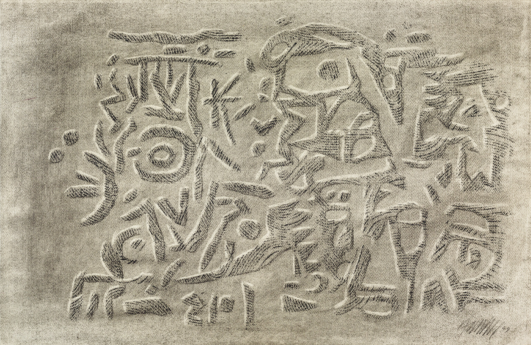 Kohle, gewischt, radiert, Ölkreide in Schwarz, durchgerieben, fixiert, auf chamoisfarbigem Ingres-Bütten mit Wz. l. o.: ...ONTGOLFIER FRANCE und r. u.: Kartusche
