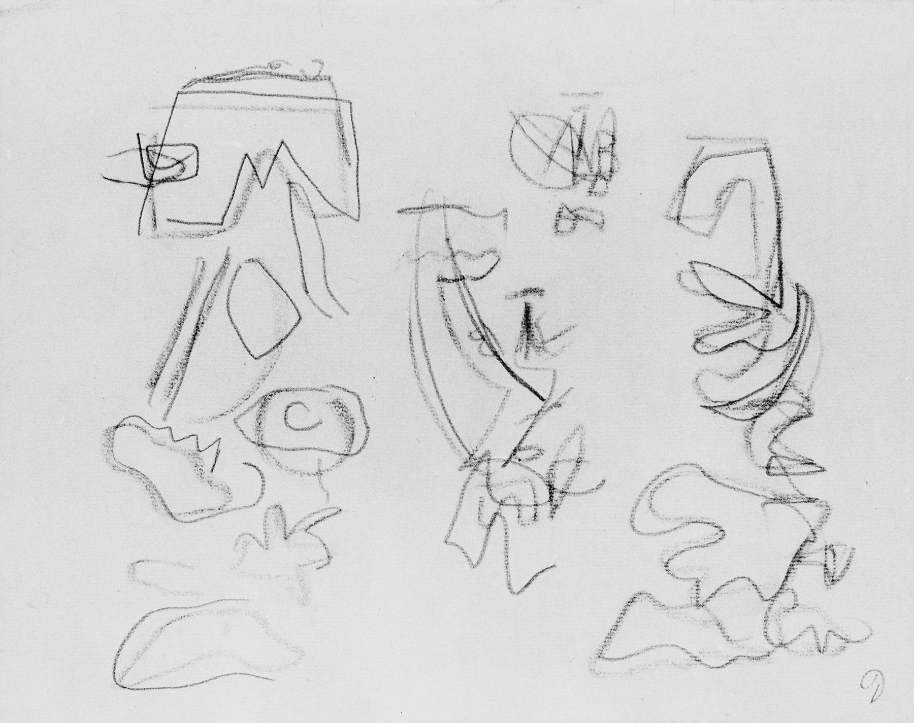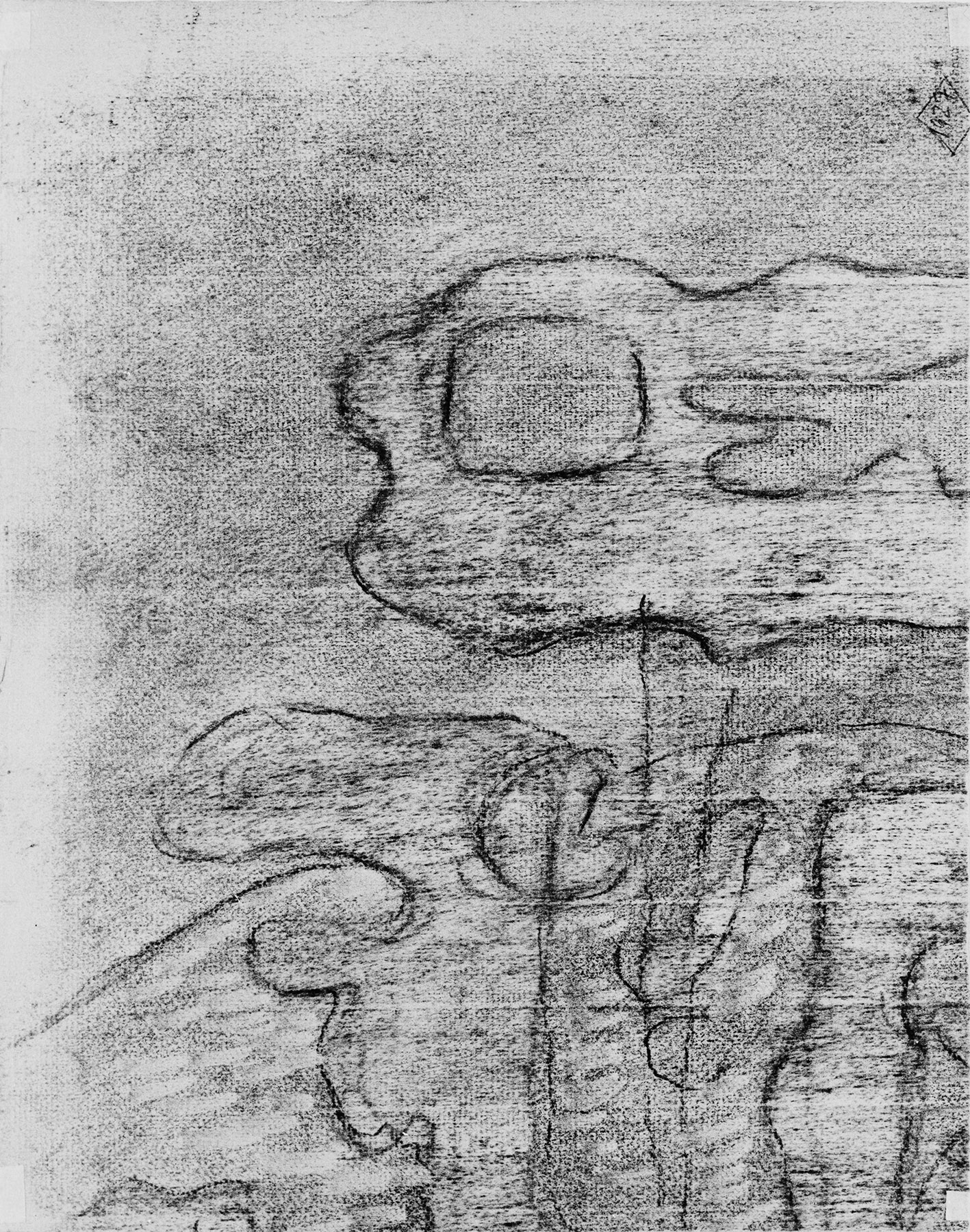 Kohle, Bleistift, Konturen mit großen Abweichungen stark eindrückend übergangen, auf chamoisfarbigem, am Rand r. unregelmäßig abgetrenntem Ingres-Bütten mit Wz. l. o.: Hahn im Kreis