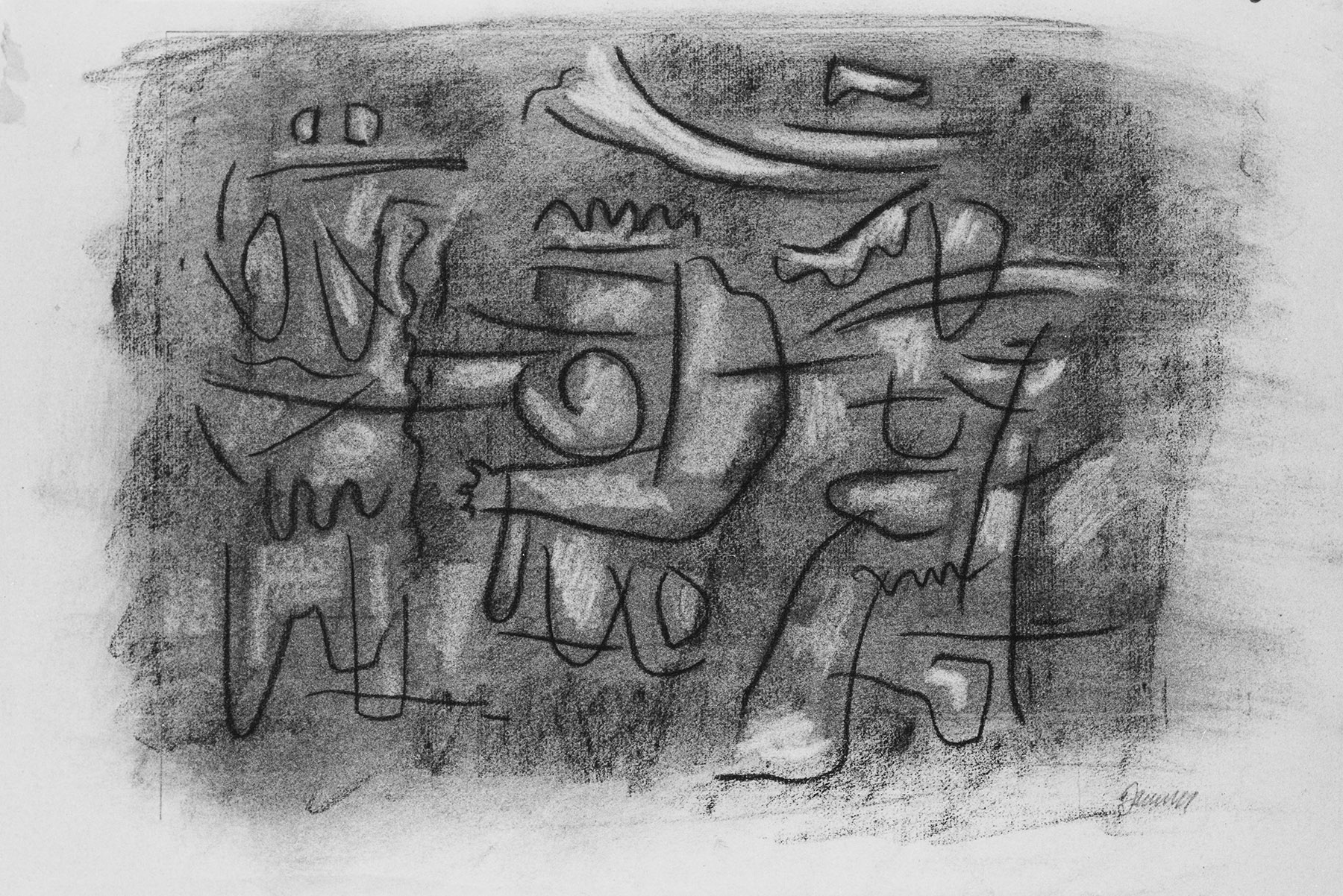 Kohle, gewischt, radiert, Einfassungslinien l. , o. und r., fixiert, auf lindgrünem Ingres-Bütten